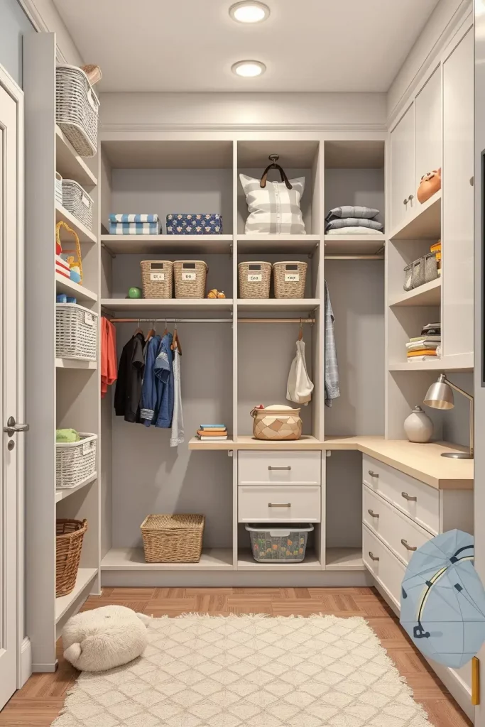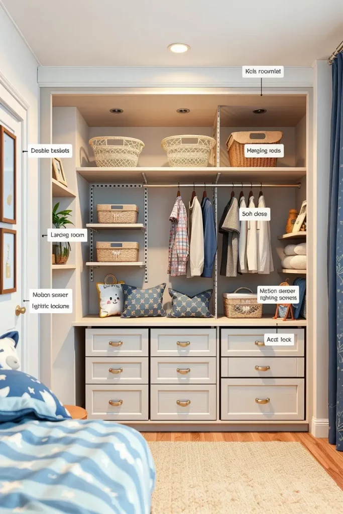 The features that I incorporate into it are a double hanging rod, built-in drawers, and labeled baskets that make children learn to be organized. The addition of small hooks, bag holders, as well as soft-close mechanisms makes the closet useful and secure.