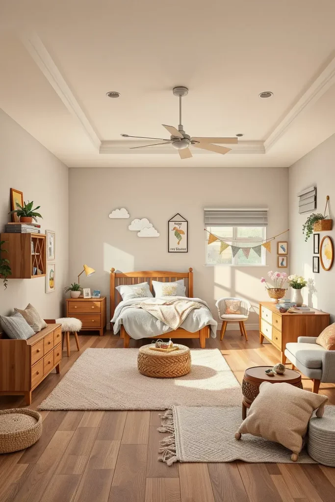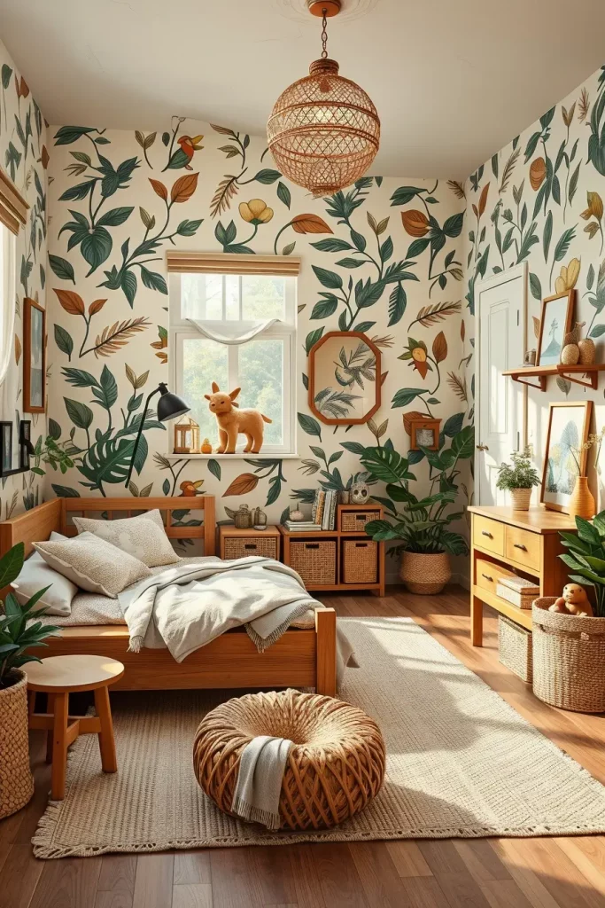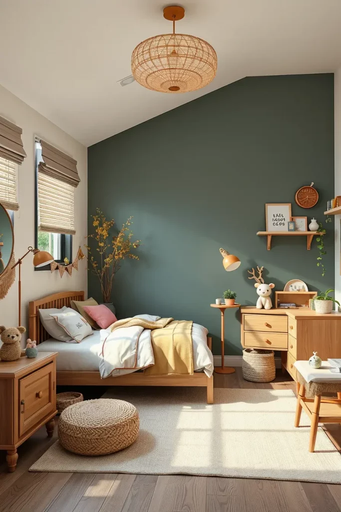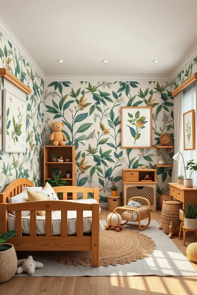 I prefer furniture that is crafted out of natural resources, rattan baskets, wooden shelving, and cotton fabrics. These are what contribute to introducing the cozy and organic feel that is kid-friendly and timeless. The addition of nature-based artworks or a wallpaper mural will be enough to add to the space without overcrowding it.
