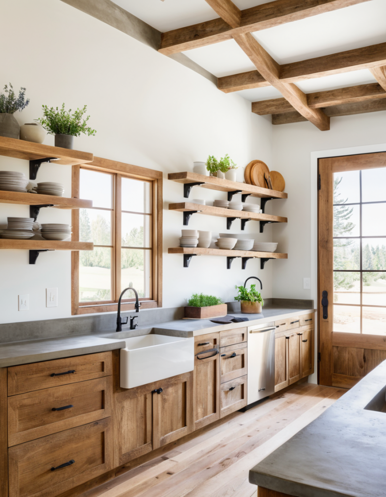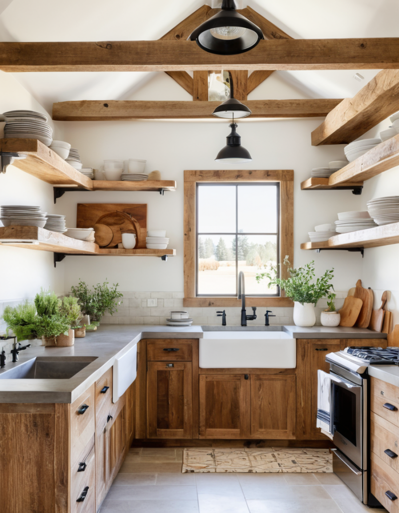 The newly revived style of farmhouse kitchens can accommodate a modern touch in 2025. The modern idea of the juxtaposition of old-school coziness with the cutting edge of the contemporary kitchen design is realized through the combination of the materials and shapes such as wood, exposed beams, and apron-front sinks. High-tech, stainless steel appliances, concrete countertops, and minimalistic cabinetry features fulfill the urban look that the owner seeks. Displaying of glass jars and farmhouse décor on open shelves is the means of the room’s better aesthetic and function.