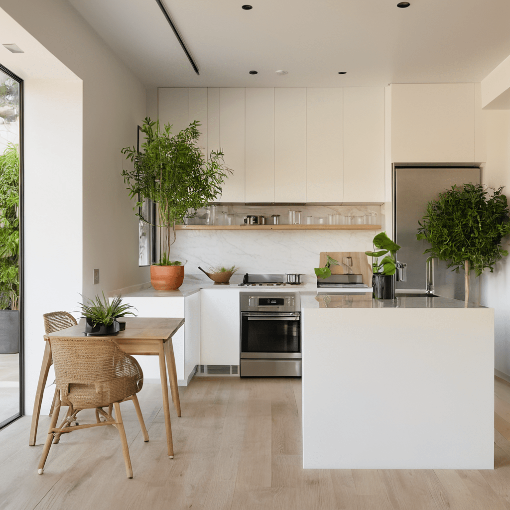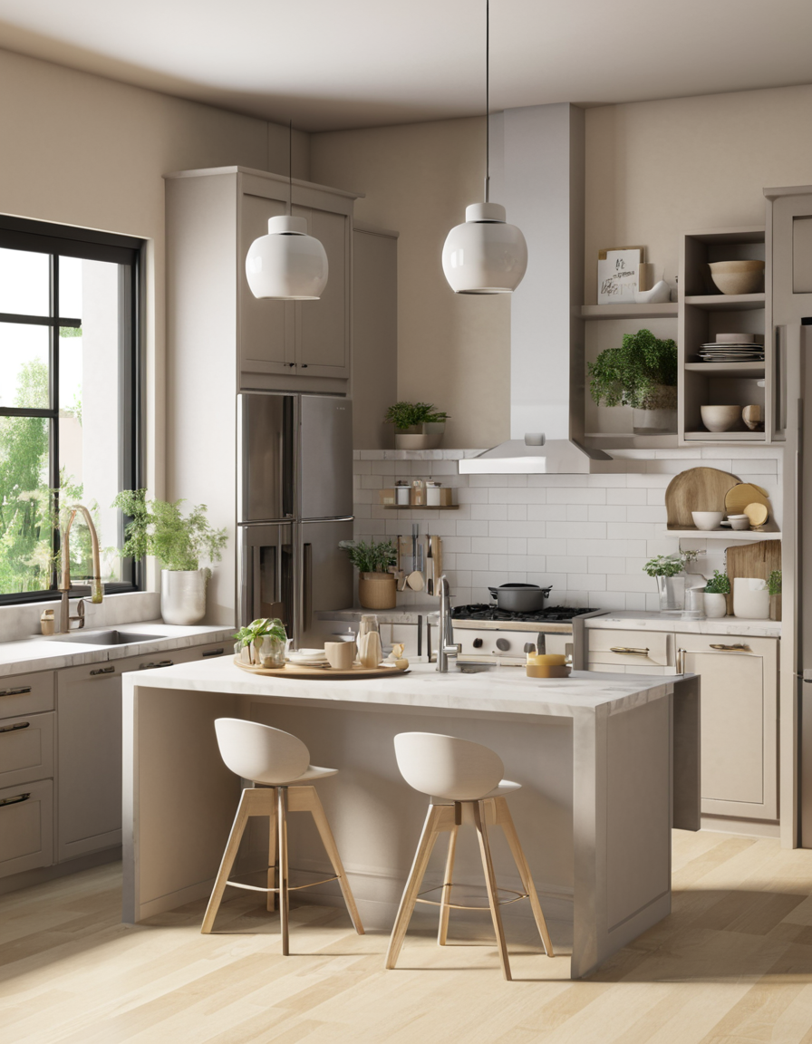 The incorporation of simplistic kitchen design elements creates a nice visual effect as well as a functional one. The main ideas of this style can be presented by selecting simple lines, neutral shades, and empty surfaces, which give a calm atmosphere and a sophisticated nature. Even textile and furniture should be modern and non-bulky to be a match to the kitchen’s design. The core aim is to impress with quality and productivity while sticking to neatness, which allows the kitchen to appear capacious and elegant at the same time.