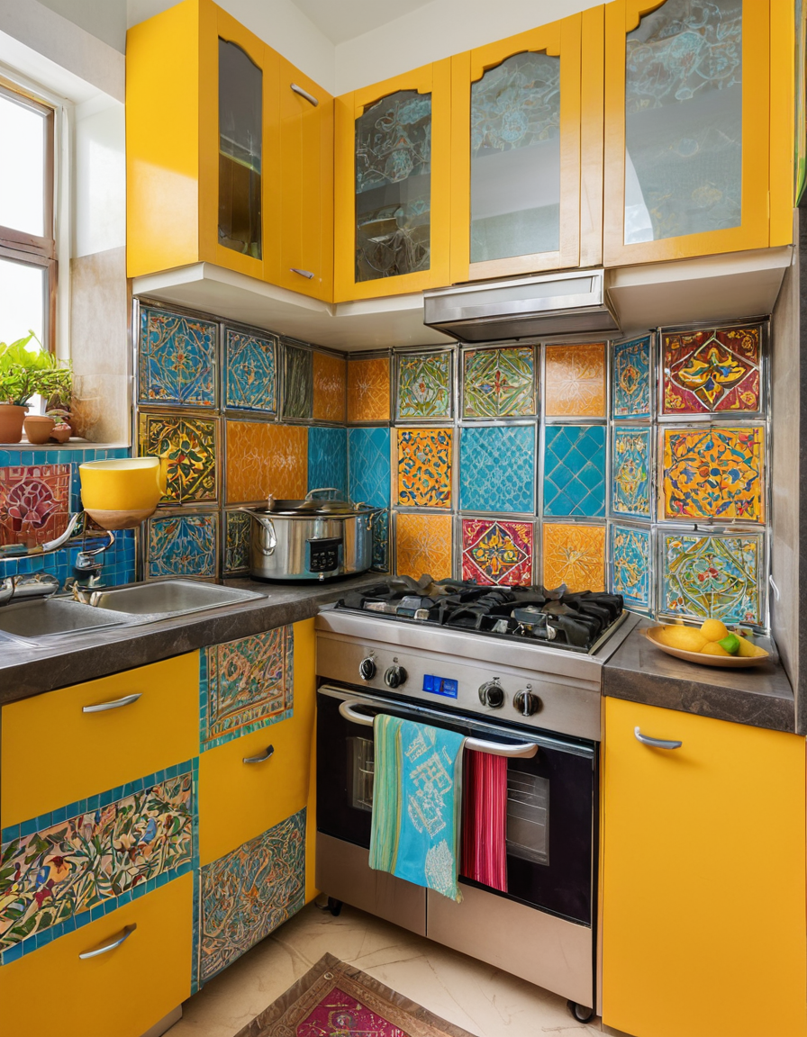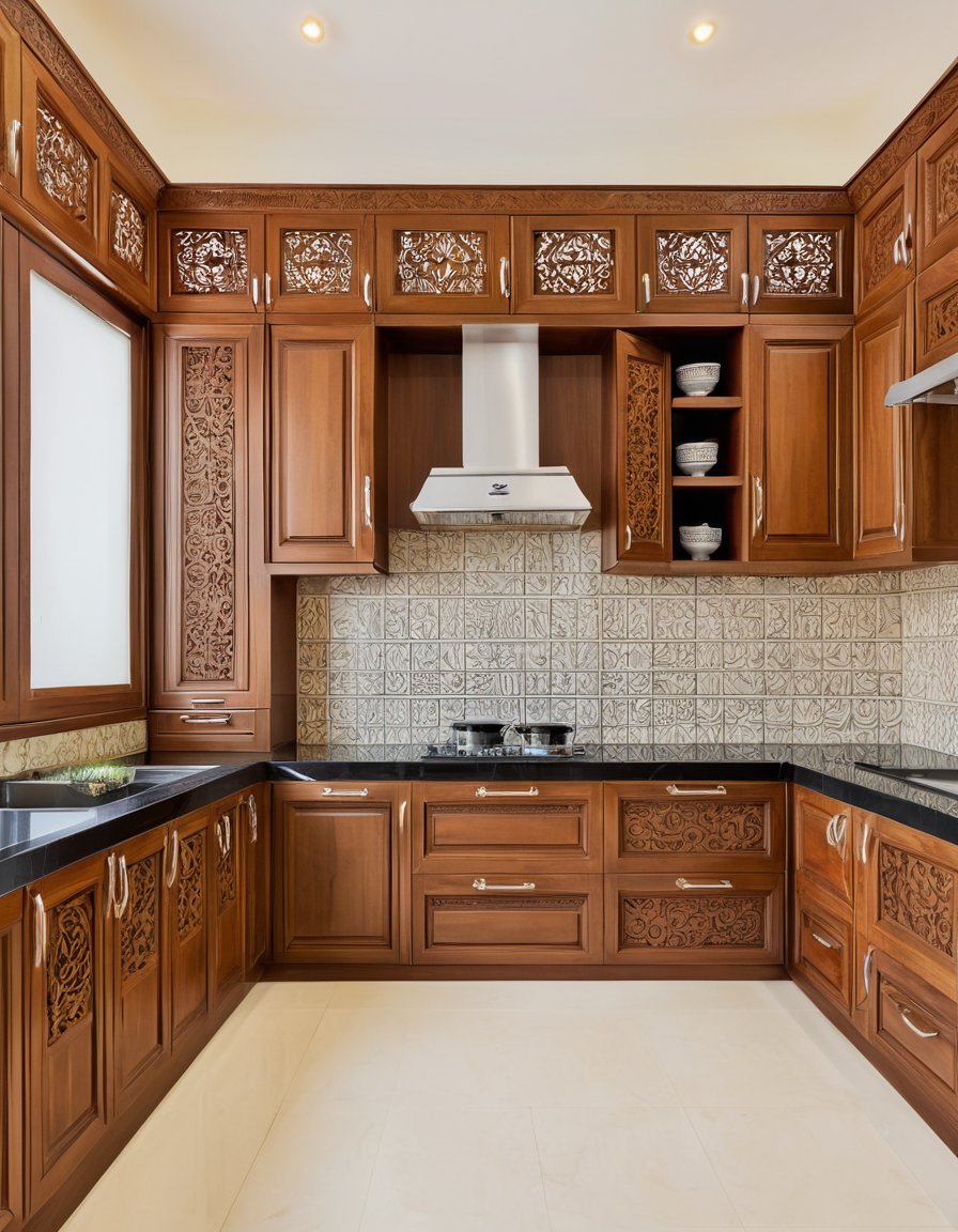 Colorful and finely-made Indian kitchens are loved all over the world. Put characteristic Indian features such as delightful and richly detailed furniture and decoration, and diverse textiles in use to develop a cozy and ambient space. Apart from that, the right color palette can be selected that will entail striking tones like crimson, gold, and aquamarine reflecting the authentic Indian design.