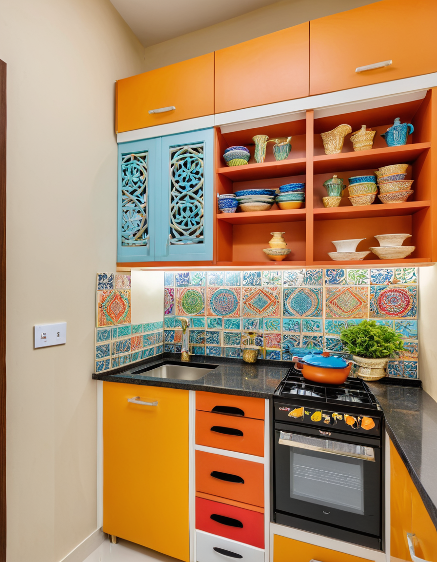 Modular storage solutions are especially valuable in Indian kitchens where space can be an issue. These solutions involve cupboards that can be customized, shelves that can be slid out, and multi-functional furniture so that you have ample storage but maintain a clean look. Indian modular design is known for intricate patterns and vivid colors that are the result of this blending of traditions with the practical side of architecture. These solutions are helpful in maintaining neatly arranged and reachable kitchen making it possible to enjoy cooking and food preparation.
