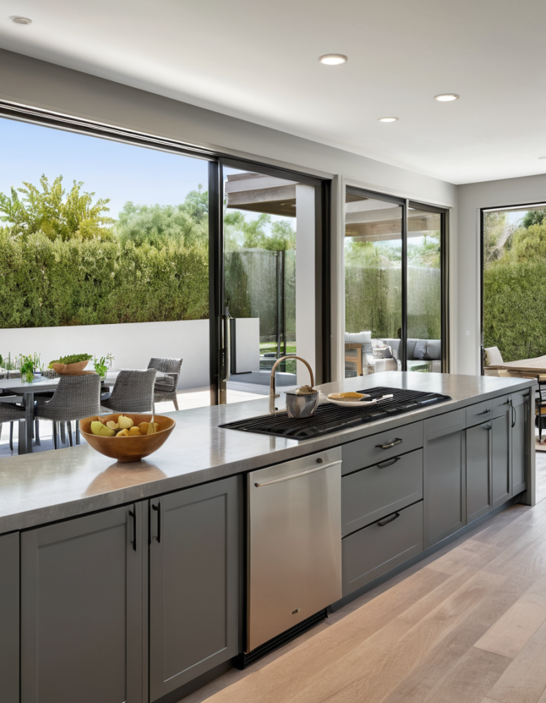 The year 2025 is marked by a trend of floor plans merging indoor and outdoor spaces, especially in the kitchen section. The blending of the indoor and outdoor facilities, as a result of open-plan designs extending into outdoor patios or garden areas, is becoming a preferred living situation, as it seamlessly connects the cooking, dining, and entertainment spaces of the house. Such a project is stylish and functional since large sliding glass doors, outdoor kitchen extensions, and weather-resistant materials are used for this type of remodeling.
