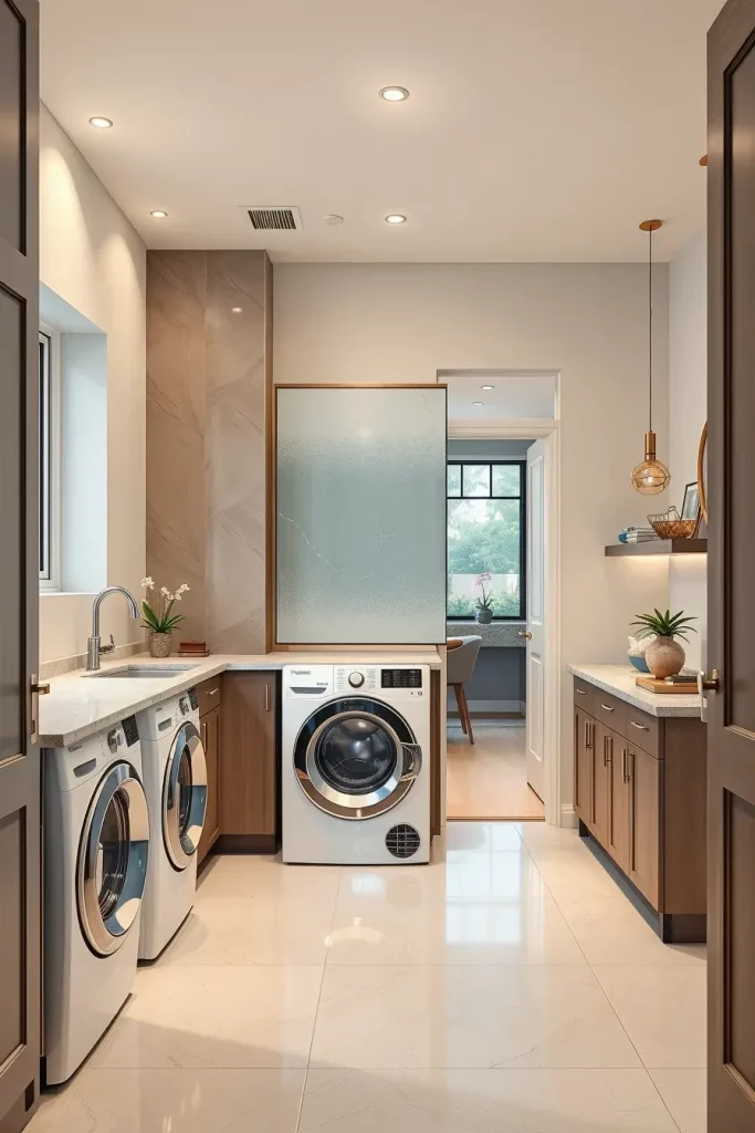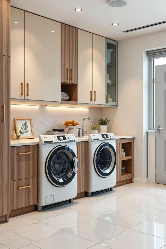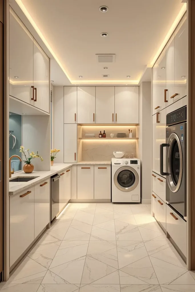 In designing such a room, I ensure that I lay more focus on ergonomics and accessibility. Cabinetry with smart washers and dryers built-in, pull-out ironing stations, retractable drying racks make the room remain tidy. Touchless faucets and LED task lights and motion sensors provide comfort and luxury to every motion in the laundry area.