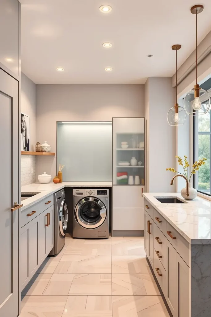 Smooth pendant lights or recessed downlights are my favorites in my designs since they do not protrude on a ceiling. In order to make it upscale to the homeowner, linear lights bars with metallic finishes such as brushed golds or matte black are frequently my preference. The use of the smart lighting systems that regulate the brightness according to the time of the day is a norm that has been integrated in the modern laundry room ideas.