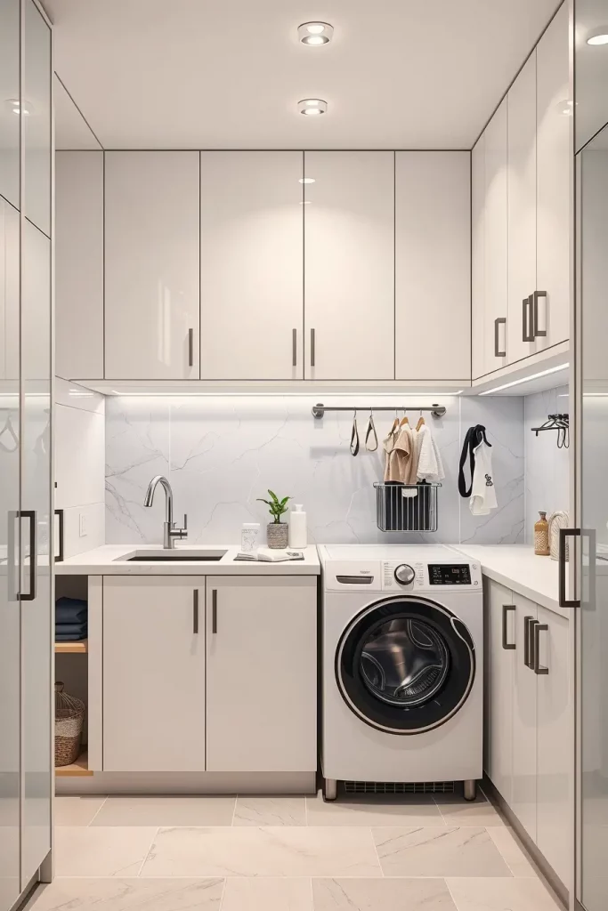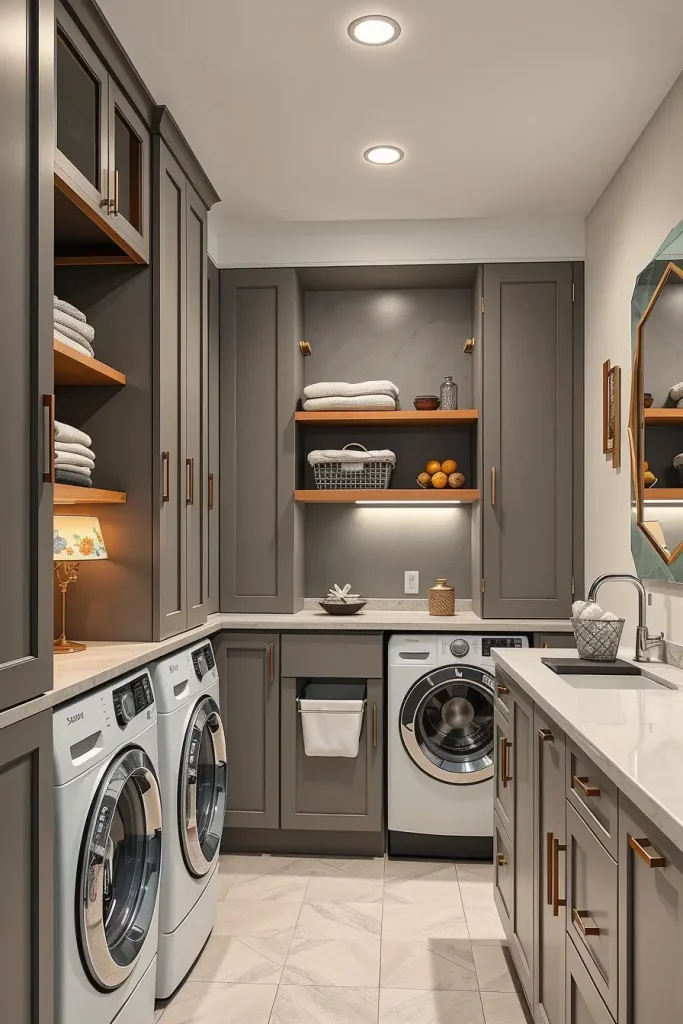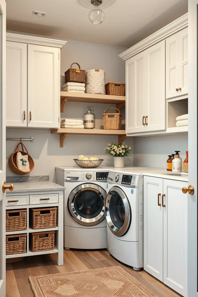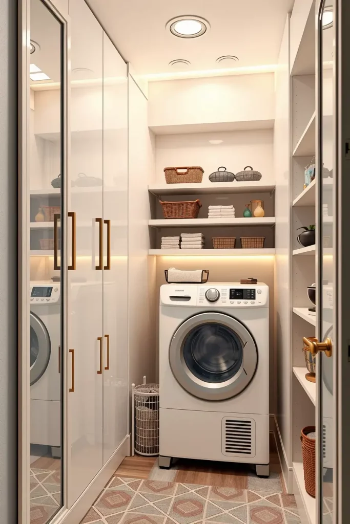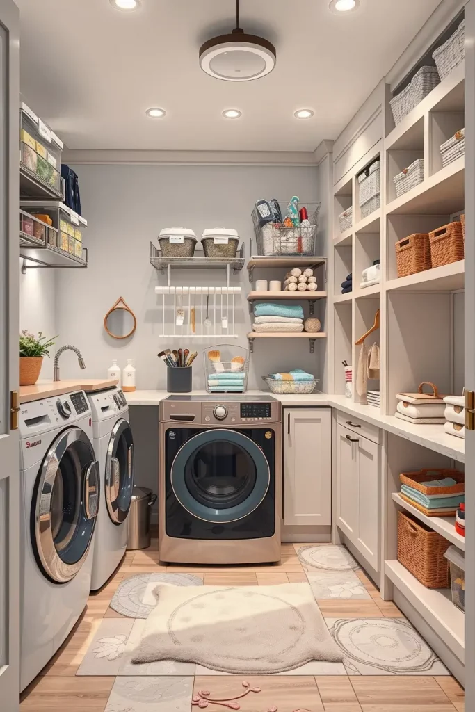 In cabinetry, I would use matte finishes in neutral colors with inbuilt LED lighting to be clear. Mobile shelves and detachable baskets are necessary. The top that is running above the washer and dryer provides a working space, and the detergent drawers are built in to maintain a well-organized storehouse.