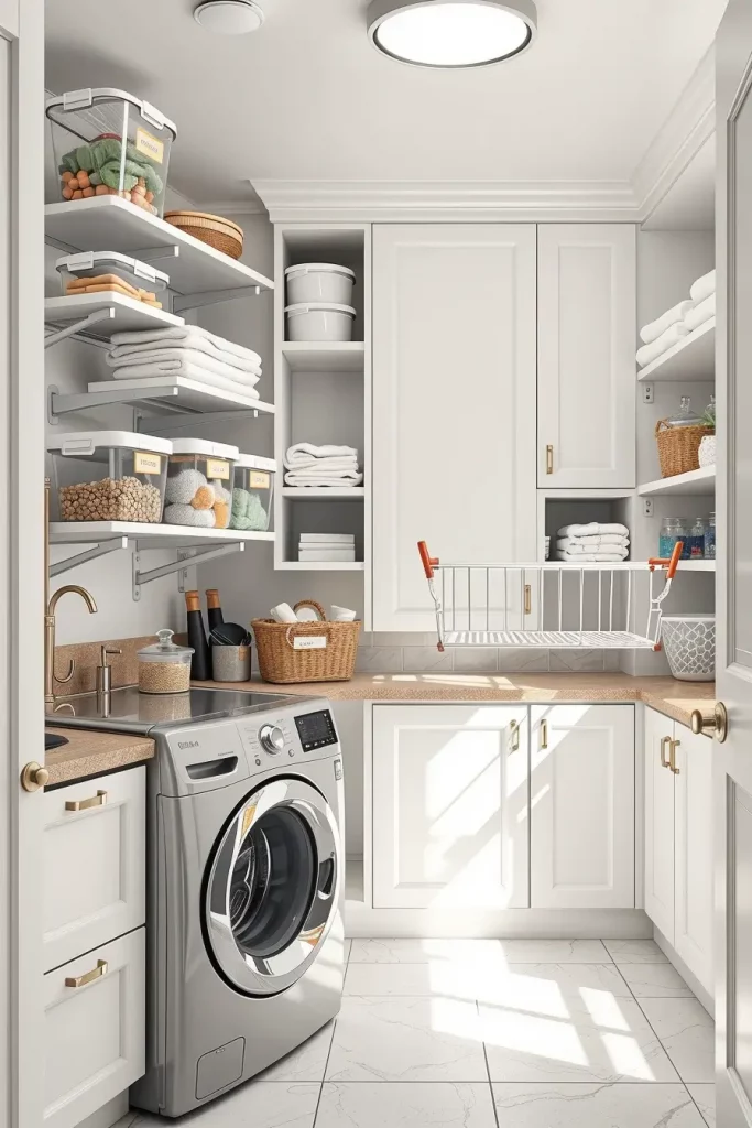 I prefer open shelving of those things used very often and closed cabinets with the storage of bulk. Adjustable shelving systems, floating shelves, and modular storage units allow changing their forms with changing lifestyles. Use of w wire or woven baskets also creates a nice touch to the general decor of the clothes washing room.