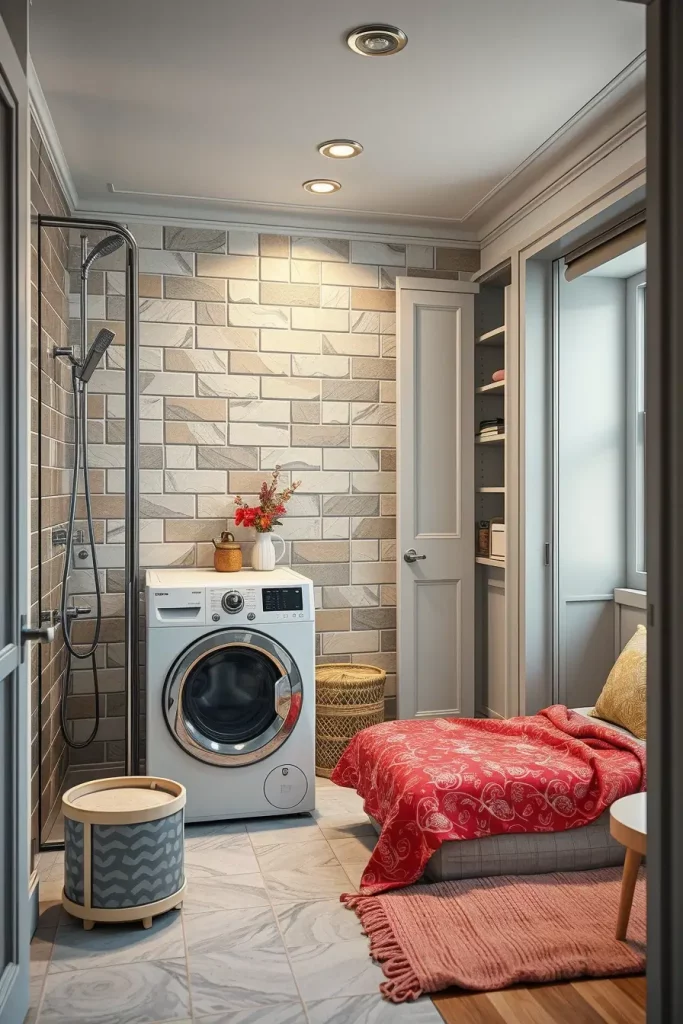 I usually use high-gloss subway tiles so that it is easy to put up and put framed prints or decorative hooks so as to make it personal. A design on the part of wallpaper above wainscoting will be whimsical and will not be overwhelming. These factors can form a unifying and motivating laundry area when properly done.