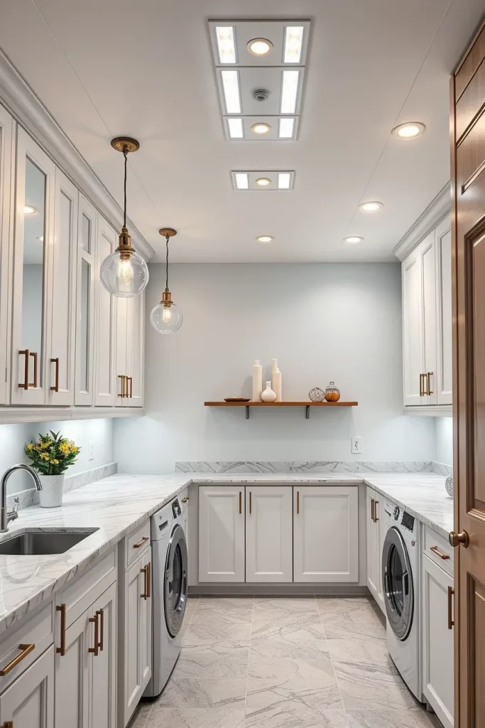 My experience has taught me that even the smallest laundry area can be changed by appropriate light and color. According to the experts at the Better Homes and Gardens, it should be used as a combination of both task and ambient lights whereby the room is made to look bigger and more welcoming by layered lighting. Personally, I would suggest using LED strips in the cabinets and sides of shelves to create a sleek look.