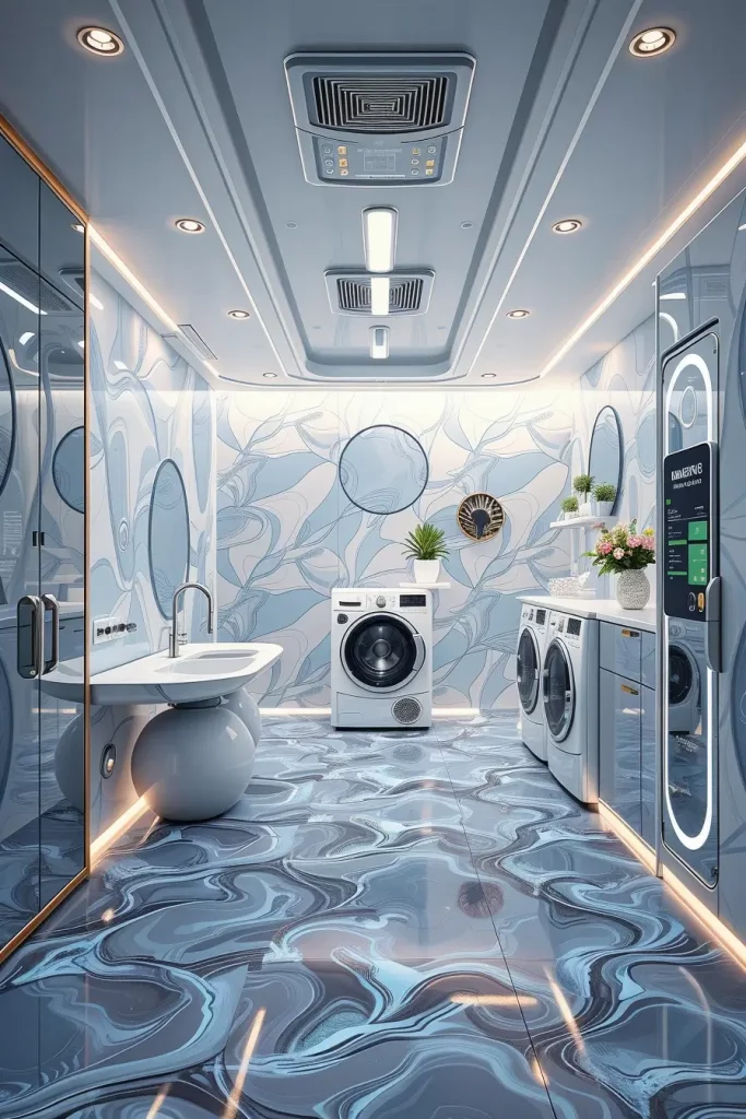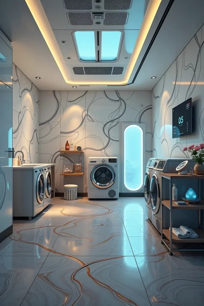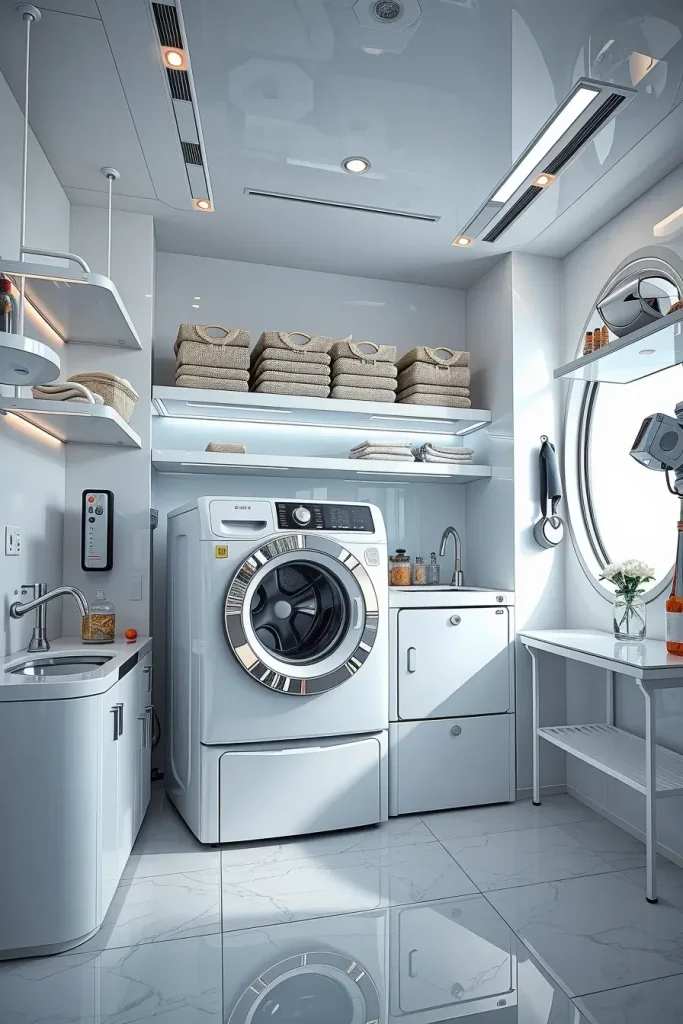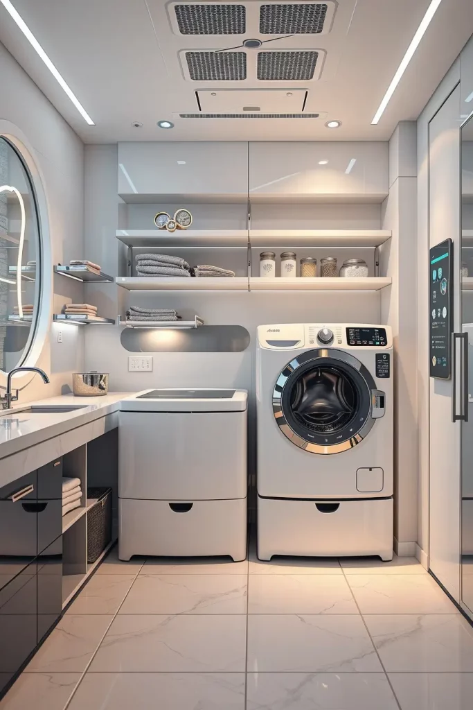 Some of the things I would suggest in such interiors are placing smart washers and dryers under floating shelves or built-in storage to ensure the interior is smooth. I am fond of incorporating intelligent control boards as well as concealed LED lamps which give a gentle ambient light. The futuristic appearance is completed by adding the motion-sensor lights and digital temperature monitors that are still practical. The design must be minimalistic, however, the use of glossy white finishes, chrome handles, and smooth touch panels should also be used to add the modern touch.