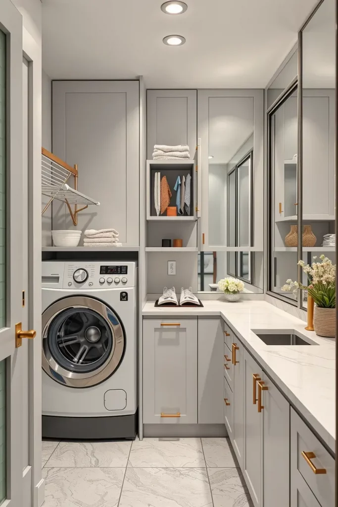 In order to design these interiors, I pay attention to modular cabinets and slim furniture. Among my favorite solutions, there are wall-mounted ironing boards, hampers, and folding surfaces that can be folded away. I like light reflective floors like pale laminates of wood and white countertops made of quartz to make the room look bigger. Mirrors or glass partitions add depth and light that is vital to the small scale laundry room.