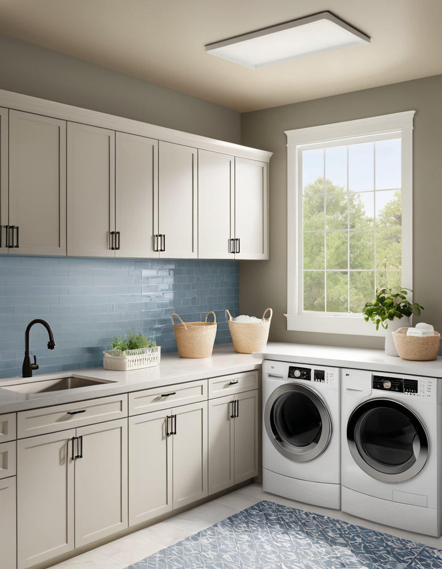 The lighting of the laundry room is an essential component in making it a welcoming and usable space. Start with a bright overhead light that may include either a flush-mount or a semi-recessed fixture, so the whole area receives abundant light. Task lighting with the help of, for instance, under-cabinet, or mounted work space areas can help to do work such as folding and cleaning. Yet, low-cost modification, for instance, setting a window or installing a skylight, can be made to allow more natural light into a room. The use of mirrors can draw in the light and thus can make the space look bigger.
