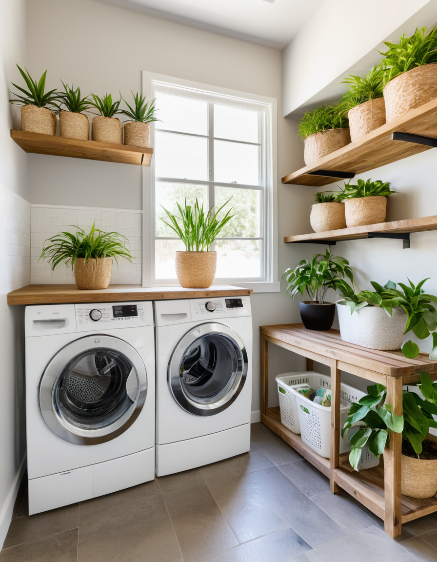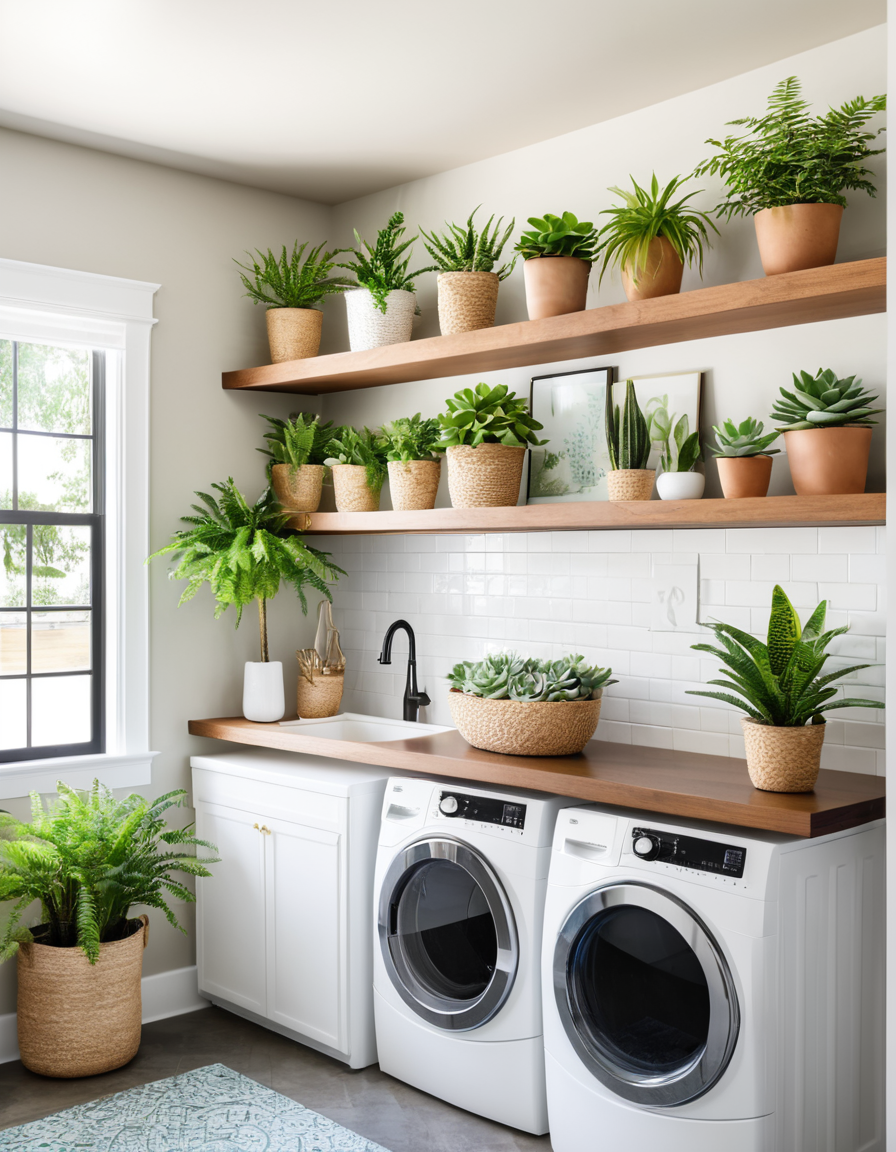 Having indoor plants in the laundry area not only beautifies the space but also adds a sense of indoor-outdoor tranquility and homeliness. Select species that are low-maintenance, like heathers, ferns, and snake-plants, which are perfect for dark areas. Either put the greenery on the shelves, tabletops, or let it swing on the ceiling-attached makeshift pots for extra decoration. Plant-based decorations are of course the winners when you have other slowing, HIM, playing the melody. Most people think adding greenery to laundry rooms is an easy and beautiful way.