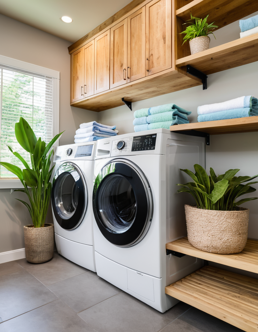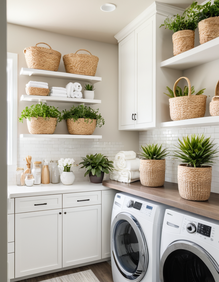 Open shelving in a laundry room serves as a style statement and, at the same time, keeps necessary items within easy reach. The use of floating shelves above the washer and dryer is for the storage of detergents, cleaning supplies, and decorative fixtures. Keeping a clutter-free look, try matching baskets or jars for the smaller items. You can also introduce some decorative elements, such as framed photos or small potted plants, to show your personality in the place. Open shelving is not just a sight for sore eyes in the room but also a smart storage option.