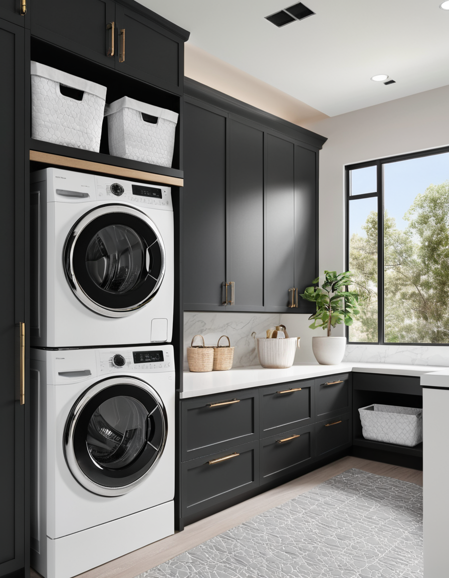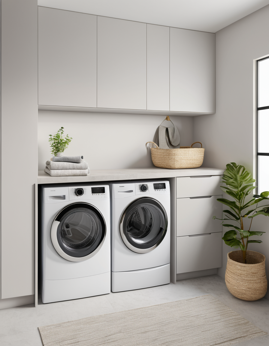 A contemporary minimalist laundry room is characterized by lines, subtler hues, and a machine factor. Hang white or light gray walls combined with modern handleless cabinets for a cleaner and straighter appearance. A simple piece of decoration like a framed print, or a small indoor plant can make the area more cozy without being too much. The orderly and functional decor in the room’s setting draws the mind away from the clutter, and hence indicates the room’s simplicity and practicality.