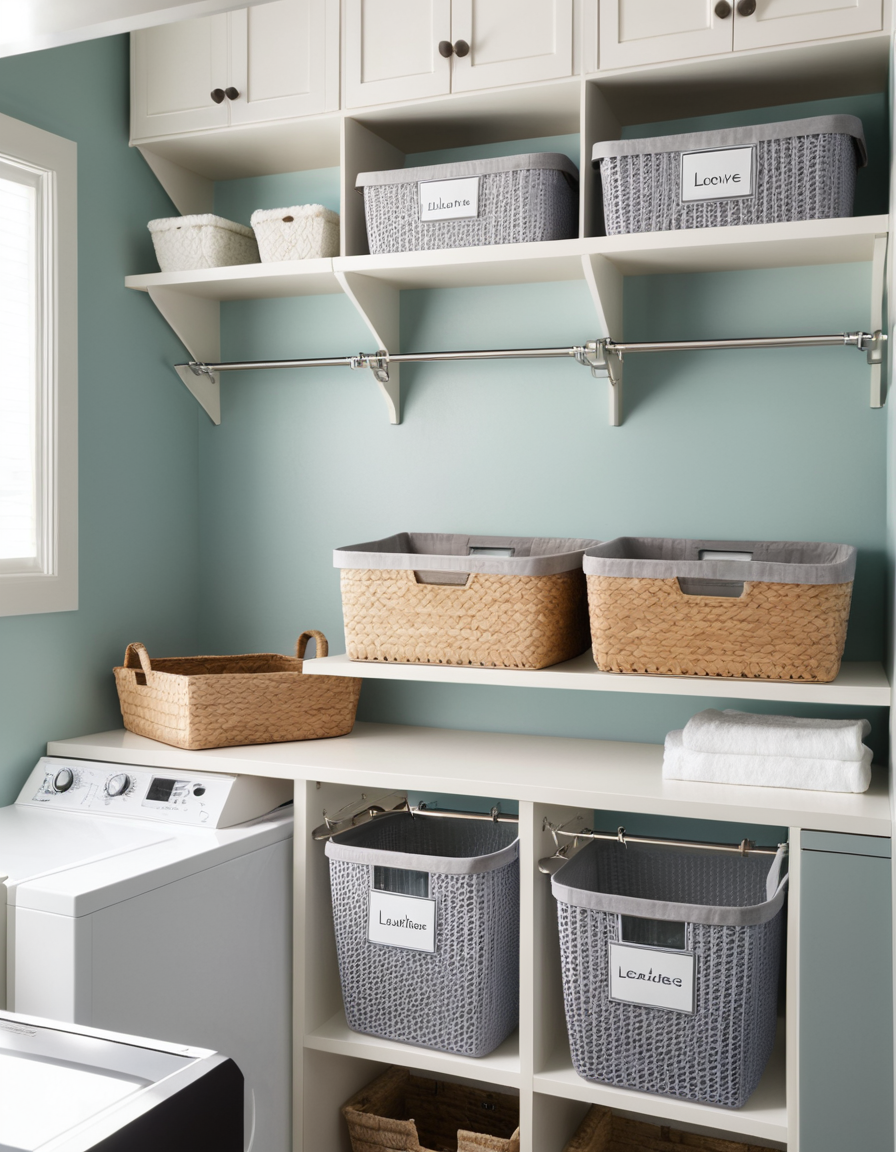 The laundry room being free from clutter and the smooth performance and non-stressful environment of the laundry routine are the most important things. Firstly you should use labeled baskets or bins for clothes sorting and storing other necessary items. Wall-mounted shelves or overhead cabinets help to clear the space and sliding baskets make the needed goods very reachable. Try to utilize transparent boxes for soaps and cleaning supplies and check when you need to top up your stocks easily.