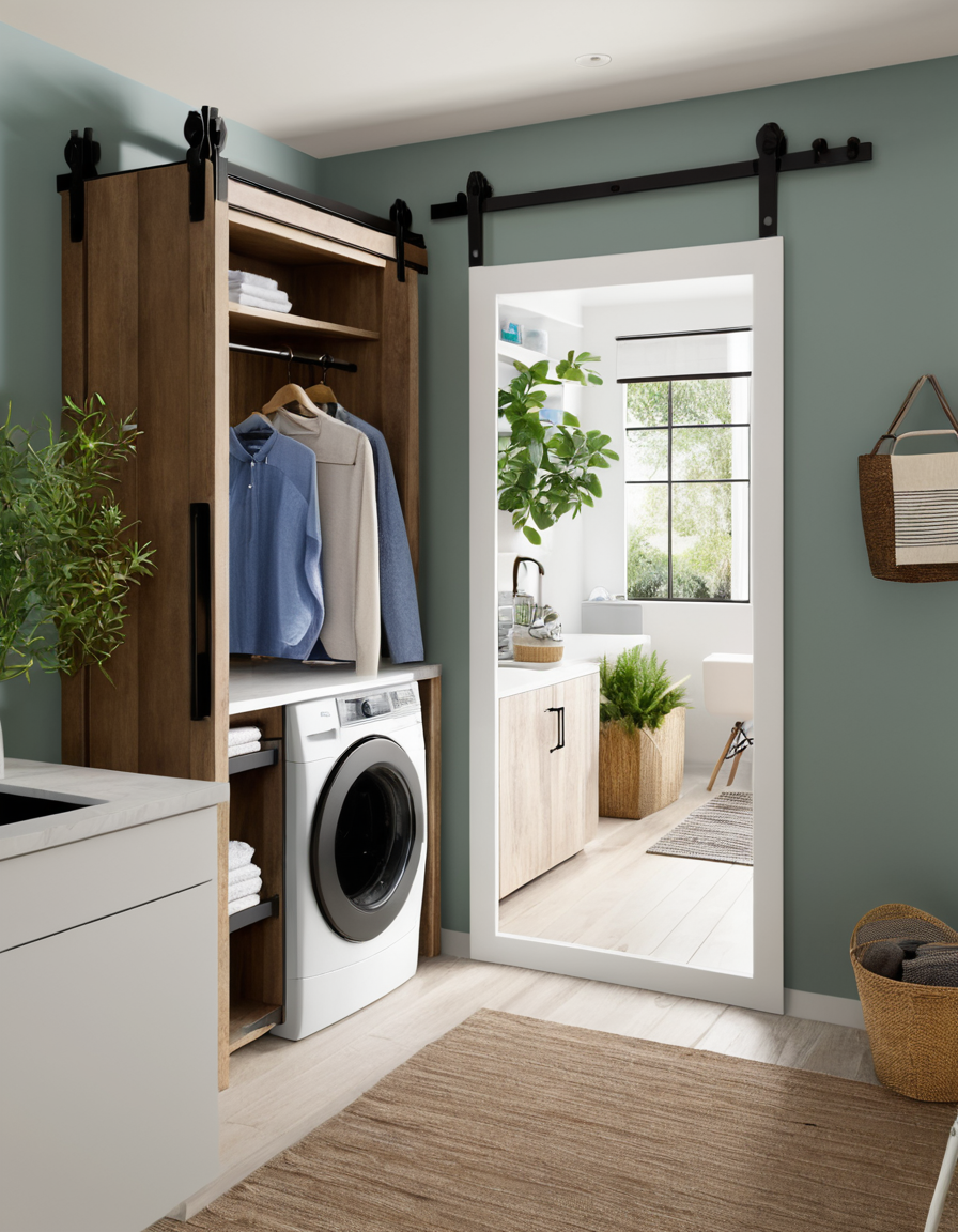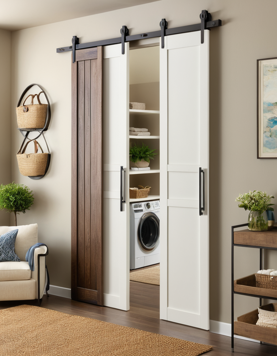Sliding doors are a modern and practical way of hiding the messy stuff in your laundry room. Even in homes with open-plan layouts or small spaces, you can keep your laundry area neat and organized with the use of barn doors, pocket doors, or indeed sleek modern sliding panels that can be hidden when not in use. Pick a door style that complements your home’s current design, be it rustic, modern or industrial. Besides having sliding doors for spatial purposes you have an unusual way of decorating your home.