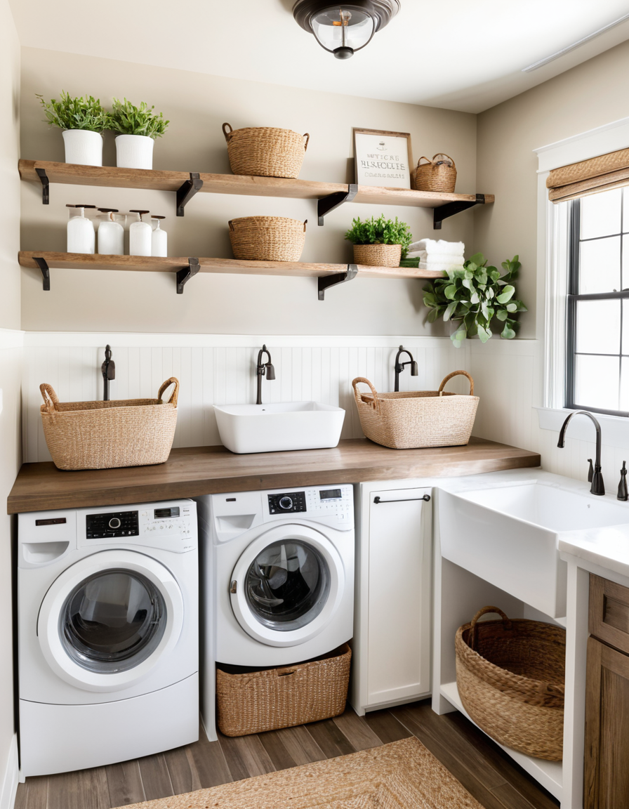 It is simple to have a cozy looking and stylish laundry room with all wooden and vintage fixtures, accompanied by the warm wood tones and shiplap wall coverings. Open shelving with woven baskets can add a rustic touch, while the farmhouse sink with bronze hardware will help get the desired look. Other than that, the room should be kept dim to make it more effective, it can be ornamented with potted plants or a vintage wall clock that will both fit the theme