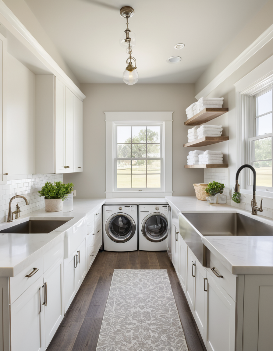 The laundry room sink is a pragmatic accessory that can fit any kind of budget. In the case of the budget-friendly variant, evaluate a stainless steel utility sink, which is not only tough but also functional. Mid-level alternatives like ceramic or composite granite sinks are able to offer a more finished look, but still, they are strong enough to last. If you want to create a luxury feel, go for a deep farmhouse sink with a fashionable faucet, which is both stylish and functional.