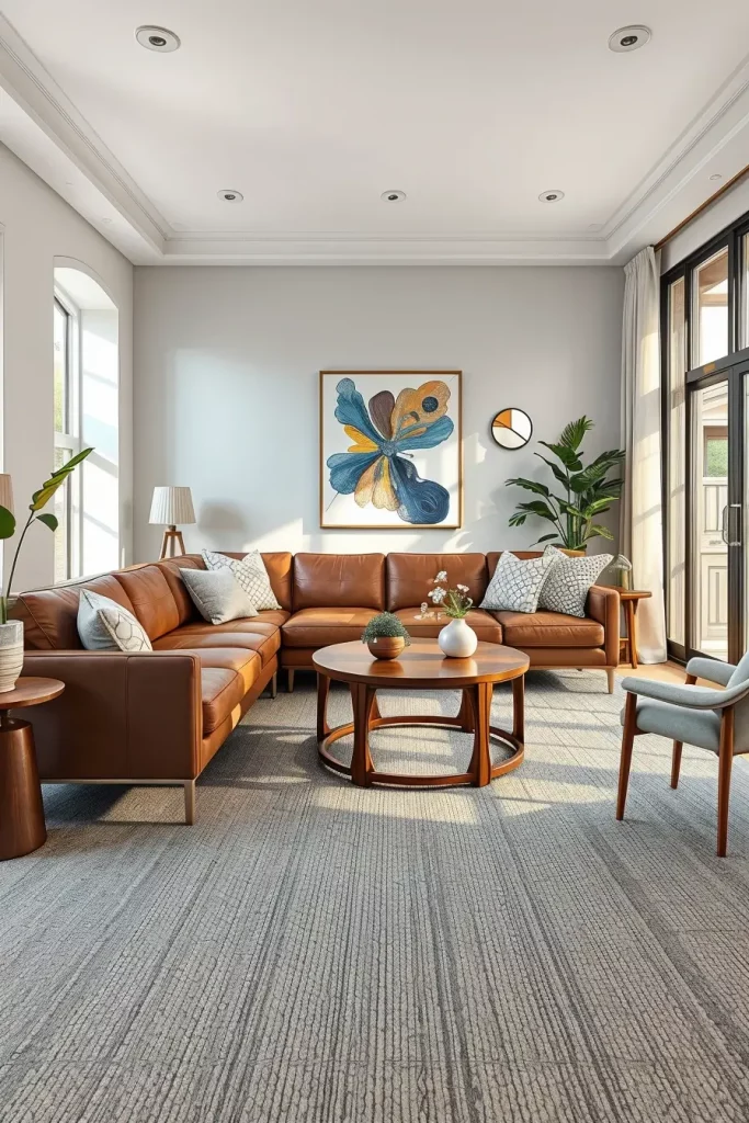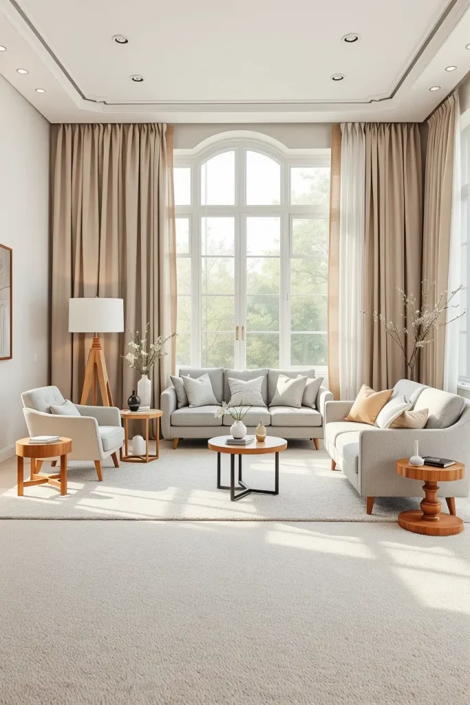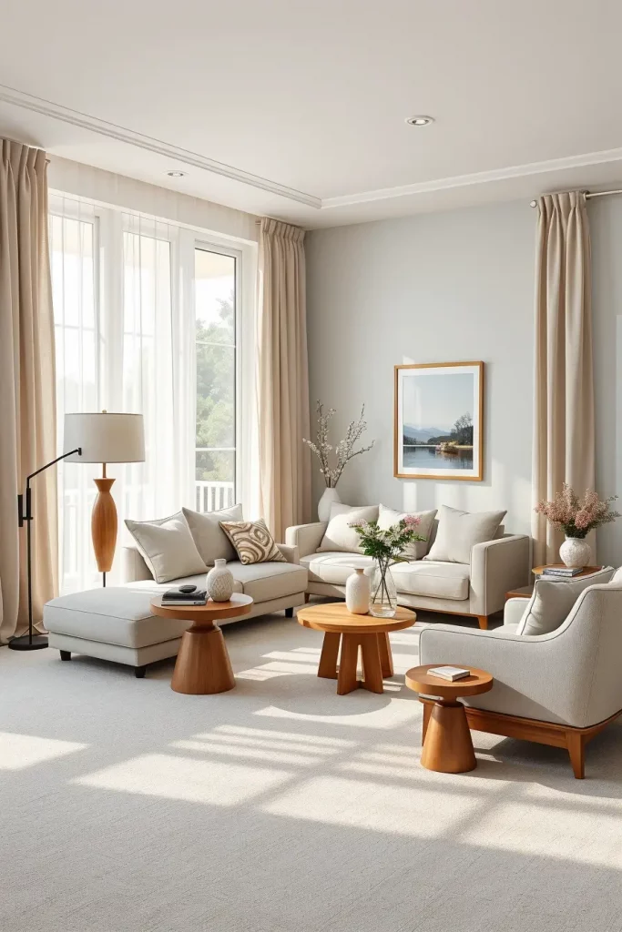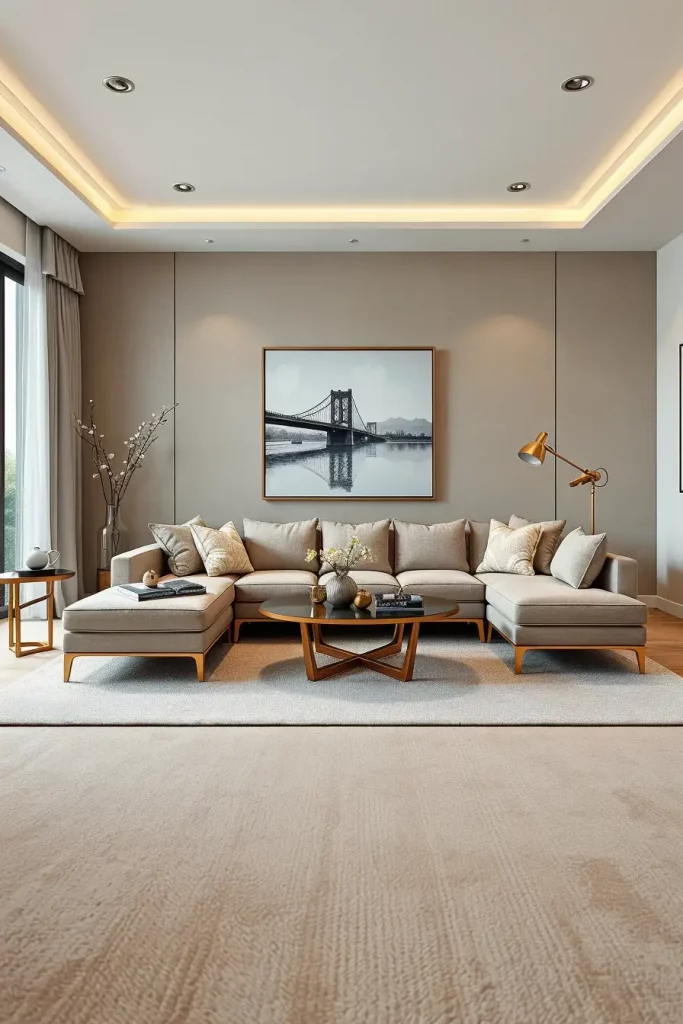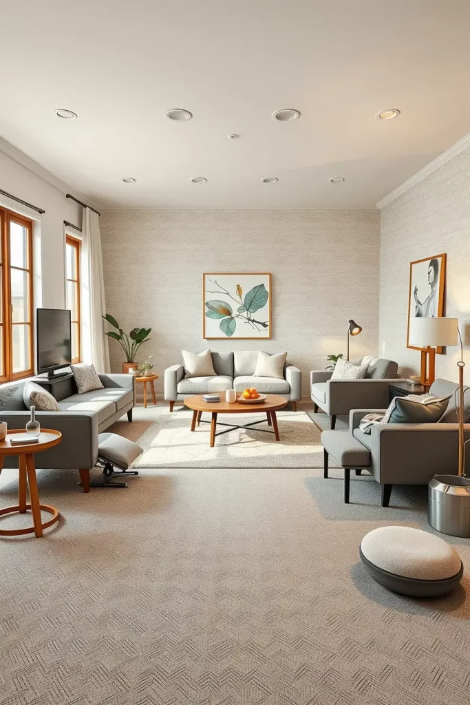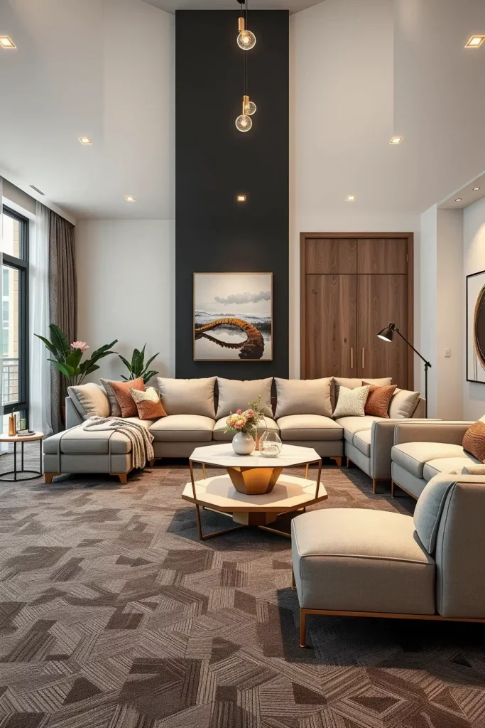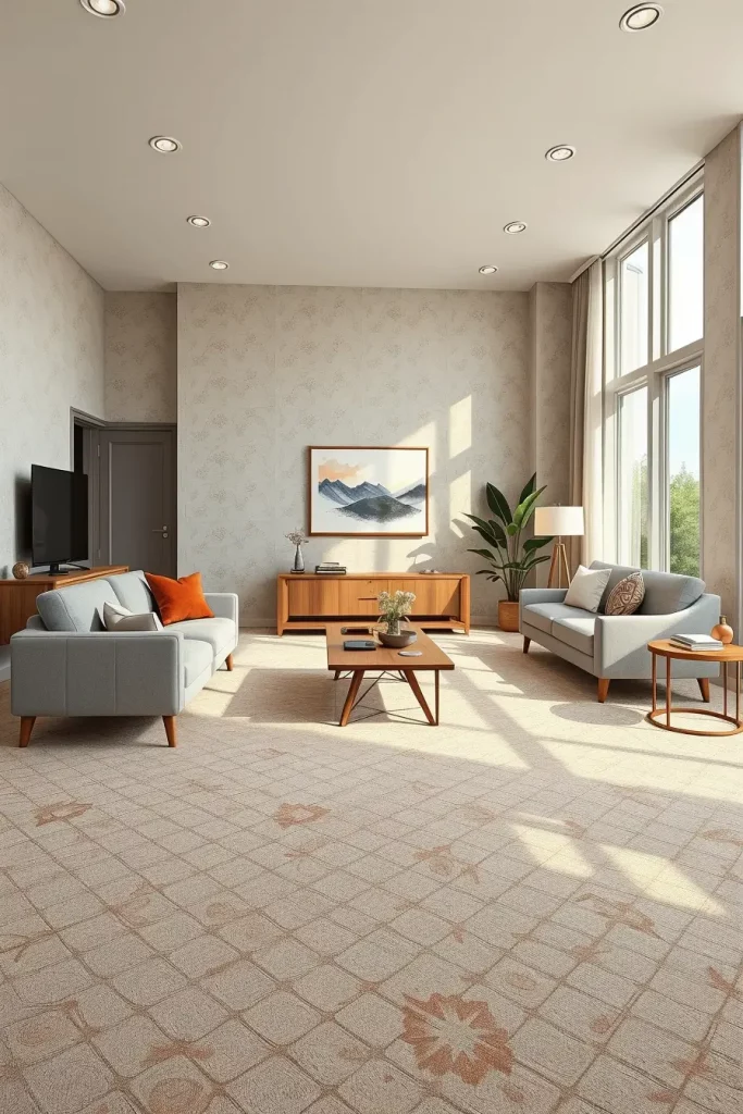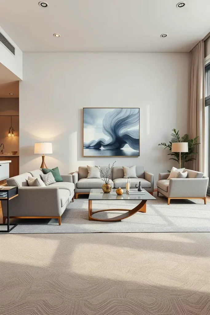 To facilitate a simple appearance, I use furnishings that have clean lines like armless sofas, side tables made of smooth wood, and neutral-looking media units. I also feature discrete lighting, oversized art, and minimalistic decor that are compatible with the understated sophistication presented by the carpet. These considerate designs make the room look balanced and open.