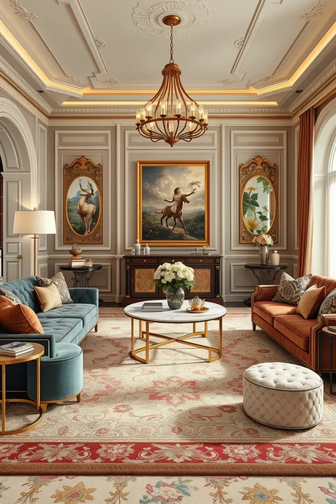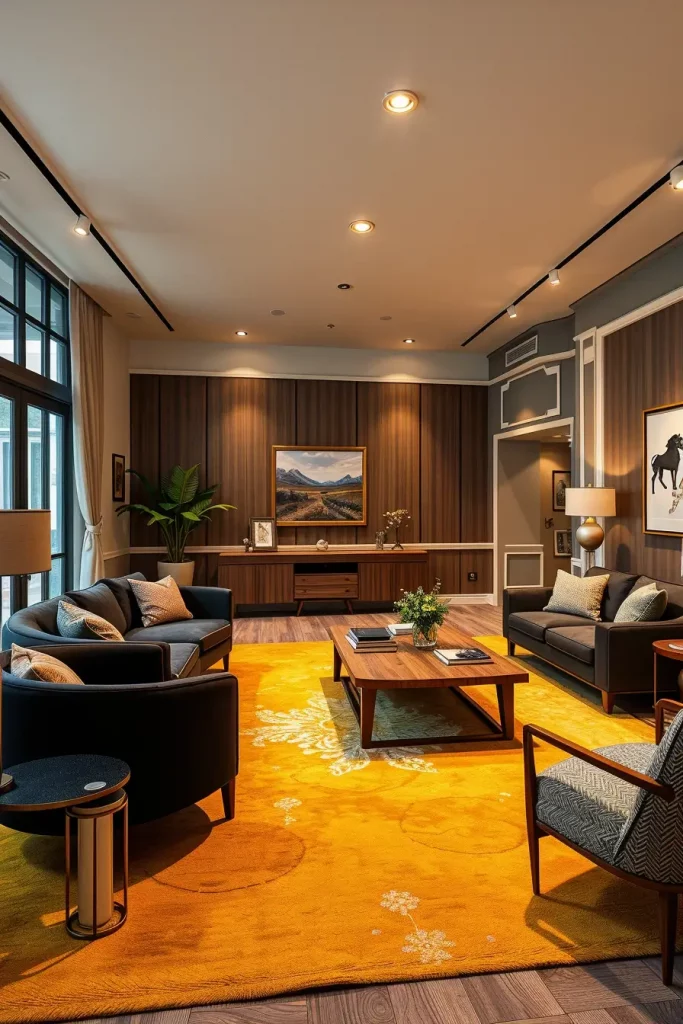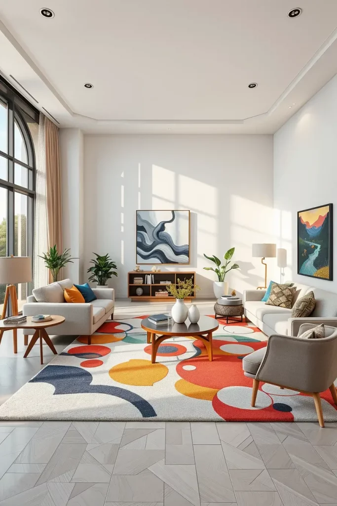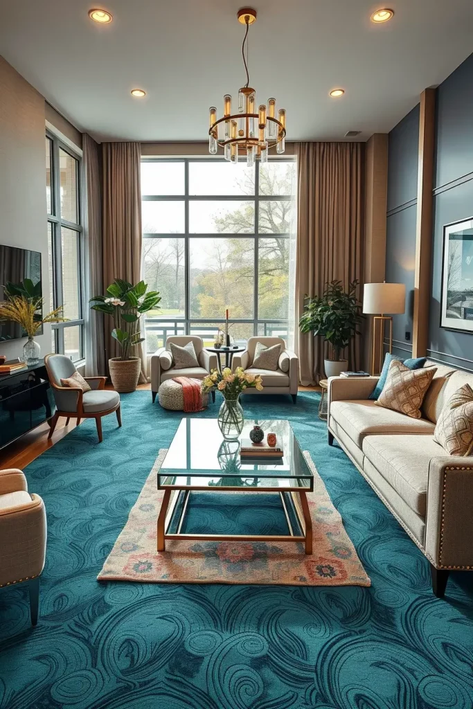 In such a design, I usually include furniture designs with smooth lines that would not overwhelm the carpet as it has a strong presence. The ideal trouble is created by neutral-colored sofas, glass-coated coffee tables, black accent furniture and metallic decorative lighting. The bold carpet is the anchor of the whole room by making the supporting elements subtle.