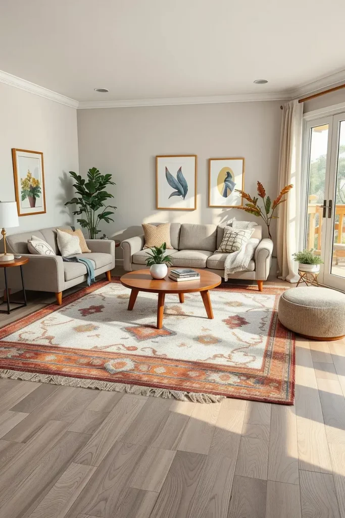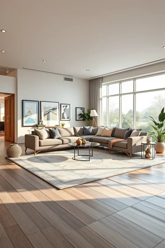 In open concept living rooms, I have always discovered that a well chosen area rug would be the point that would visually divide the living rooms space without segregating them. In coming up with these layouts, I would like to use large rugs that can accommodate the seating area and at the same time leave the rest of the architecture open and connected. This contributes to the natural circulation between residential, dining, and kitchen spaces, which is one of the benefits of open concept houses. The correct size of a rug will also make acoustics less harsh and cozy.