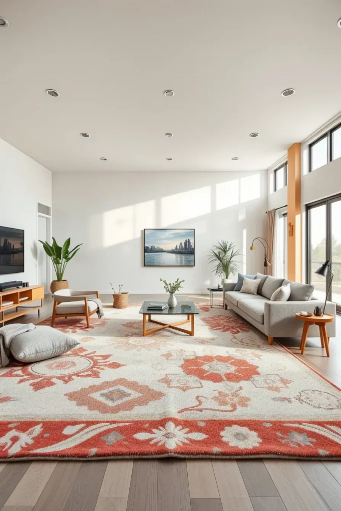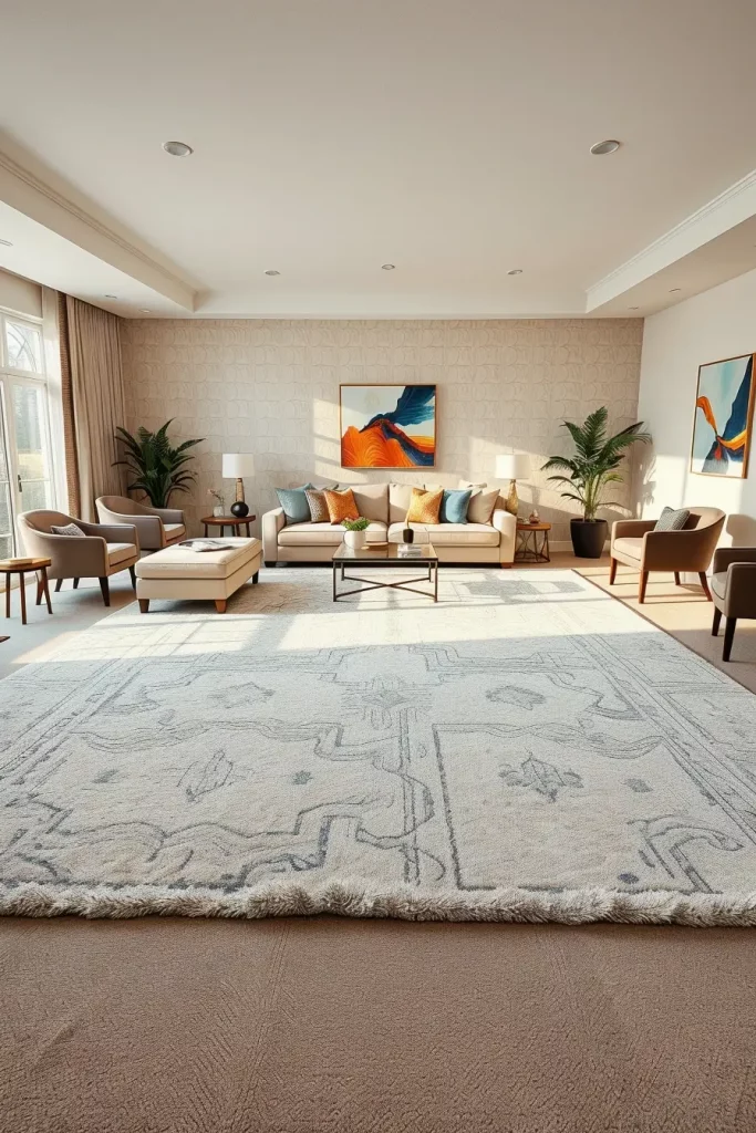 In contemporary spacious living rooms, I tend to suggest the use of spacious rugs that go as close to the walls as possible since they produce a smooth and expensive feeling. The method is especially effective in interiors with minimalistic or modern design, in which straight edges and compact design are of the utmost importance. The large carpet makes the entire sitting space look coherent, comfortable, and spacious, without the aesthetic hindrances that smaller carpets would create.