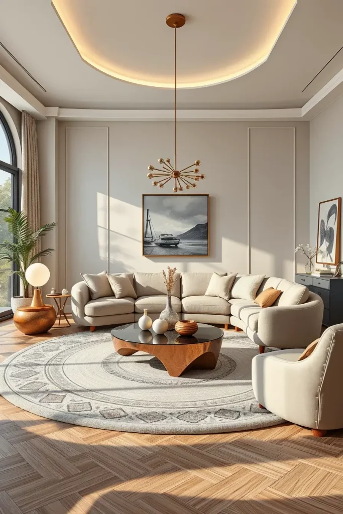 In selecting furniture to complement a round rug, I use a curvy sofa, a round table which is sculptural, or accent chairs that repeat the round shape. Elementary rounding contributes to enhanced cohesion and creates the impression of inviting and natural seating arrangement. A circular carpet is also ideal in accentuating a reading corner or a small conversation space.