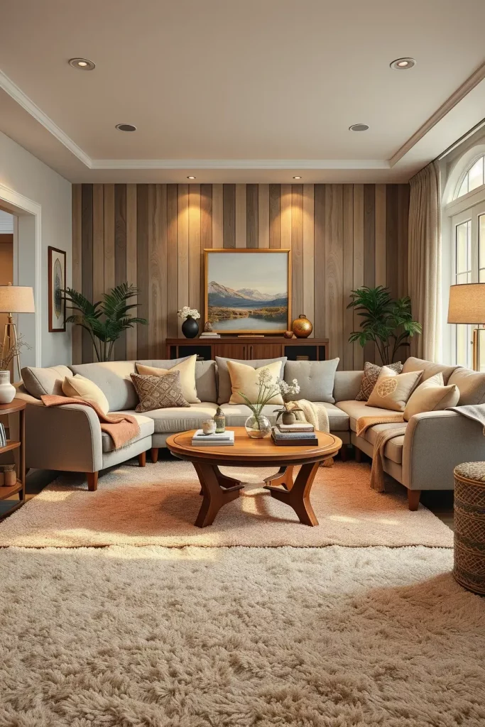 Furniture I combine with fluffy carpets may consist of deep and soft sofas, upholstered ottomans, round coffee tables, and cozy-colored lights. Such furniture adds to the warm atmosphere and makes the living room look warm and cozy. The softness of the carpet is well balanced with the layered textiles of the pillows, which are velvety and the wool blankets.