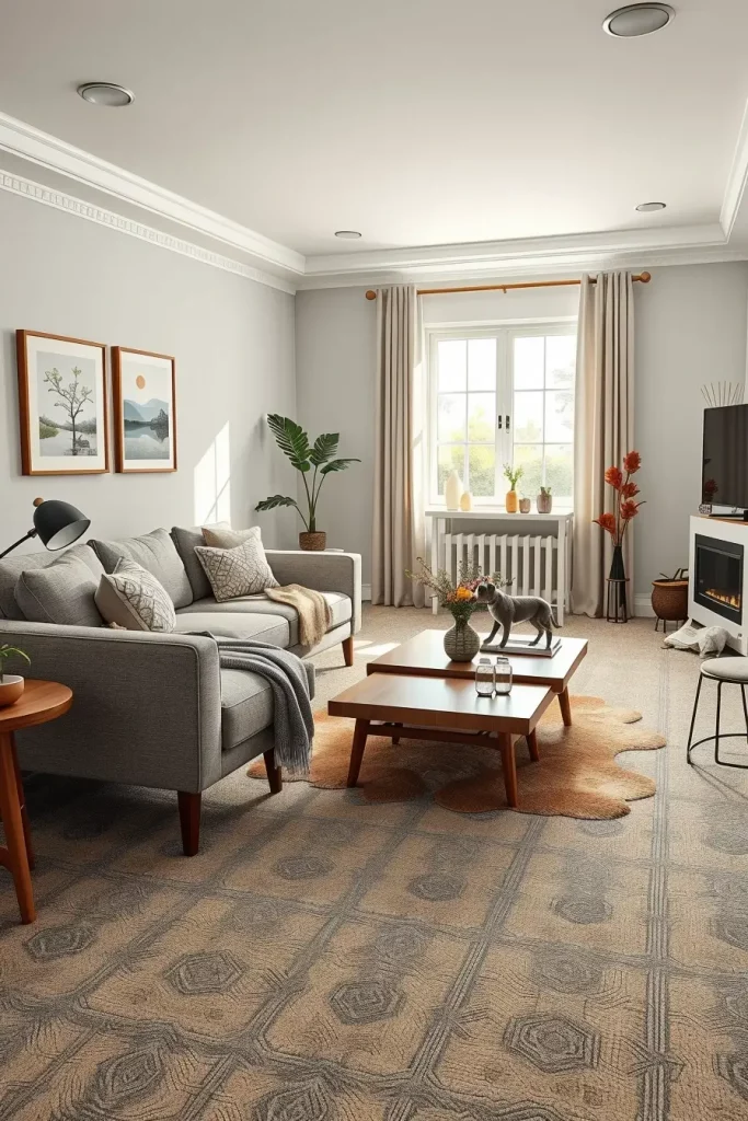 The things I would like to use in such spaces are low-pile carpets, pet friendly seating fabrics, and furniture with raised legs to facilitate cleaning. Each element, a tightly knit texture, or a slight pattern, has its purpose. The carpets reduce snagging caused by the claws and conceal small debris as opposed to ultra-light. Combining them with a durable sofa, shiny wooden coffee table, and washable throw blankets, one will get a balance of style and appearance that seems not only high-end but also useful. I will always select the design which will promote circulation of the room meaning that the carpet cannot compete with the interior.