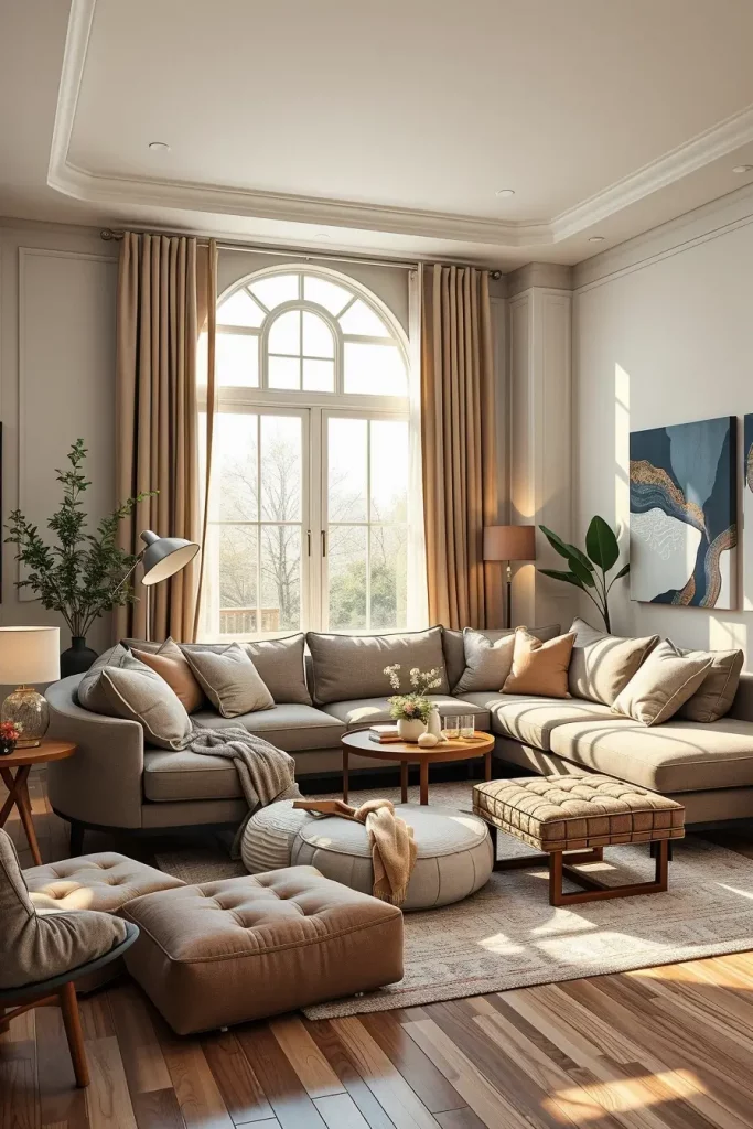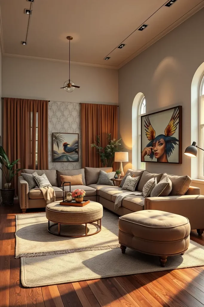 The neutral sectional sofa could be under a fancy chandelier or an old-fashioned armchair could be used with a smooth glass coffee table. The cross-weave between the past and the present brings the visual appeal with maintaining the room in the high-end realm.