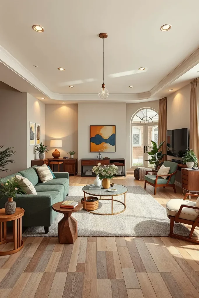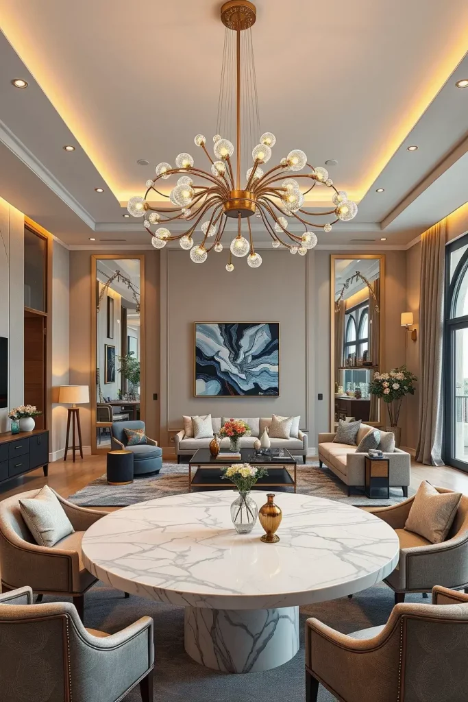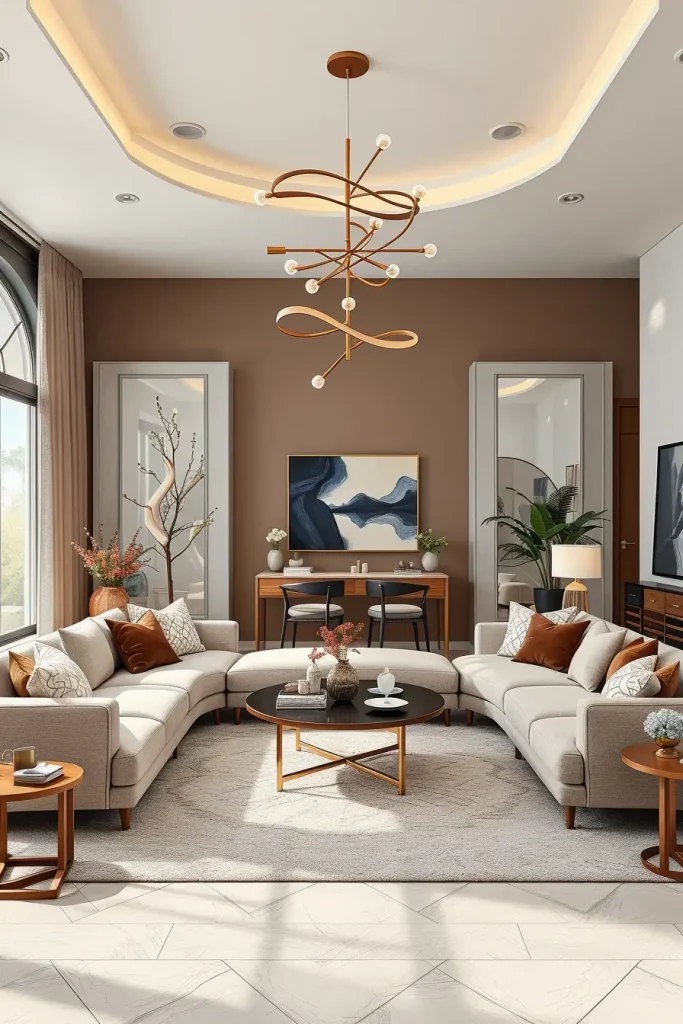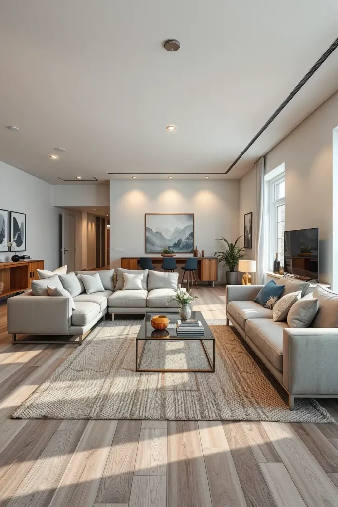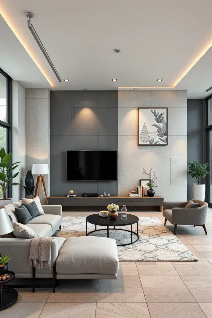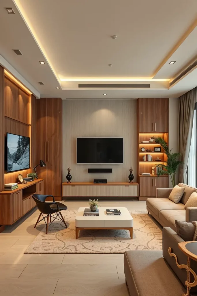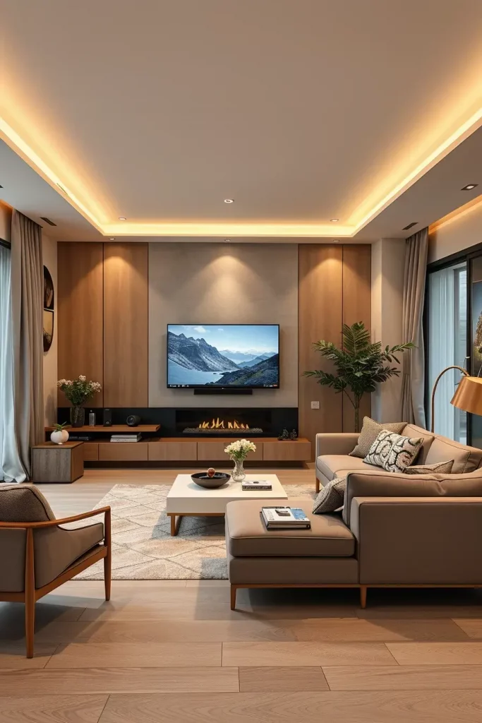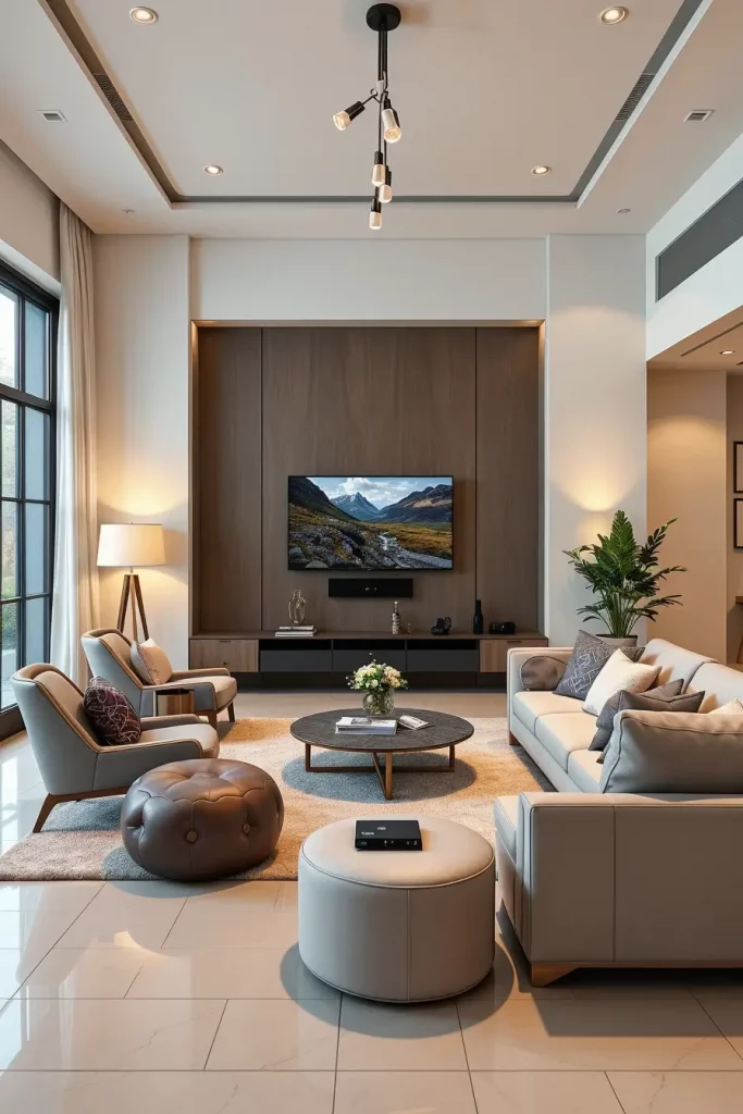 I use LED strip lighting, recessed ceiling lighting and ambient wall lighting in the design to ensure that I have multiple layers of lighting. A pendant lamp in the middle can be used to make the central sitting area grounded, and to highlight architectural features such as the ceiling moulding or the media wall, the hidden LED tracks can be used. The inclusion of voice or app-controllable dimmers will be flexible – movie nights or working-at-home flexibility.