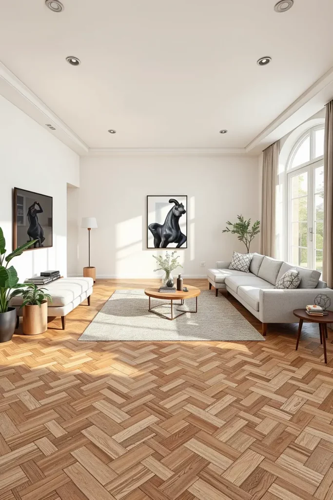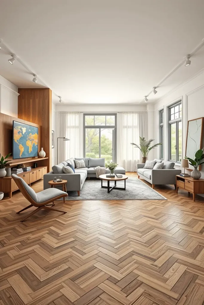 In my personal opinion, I would suggest that she use herringbone or chevron plank flooring to add some interest to the design and not to overload the layout. The most popular are light oak colors, and glossy colors have been substituted by matte finishes to also look more natural. The design is finished by warm and neutral wool or jute carpet floors.
