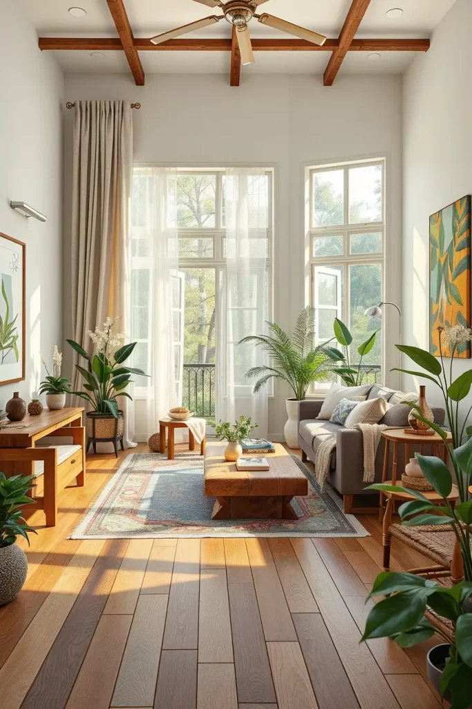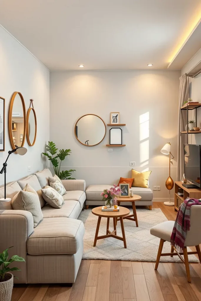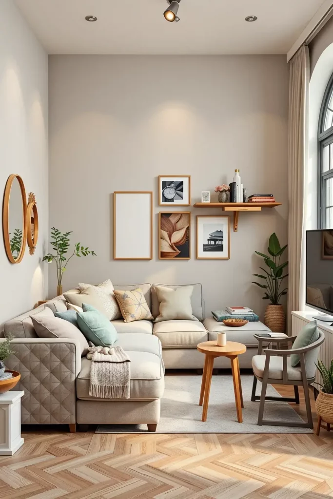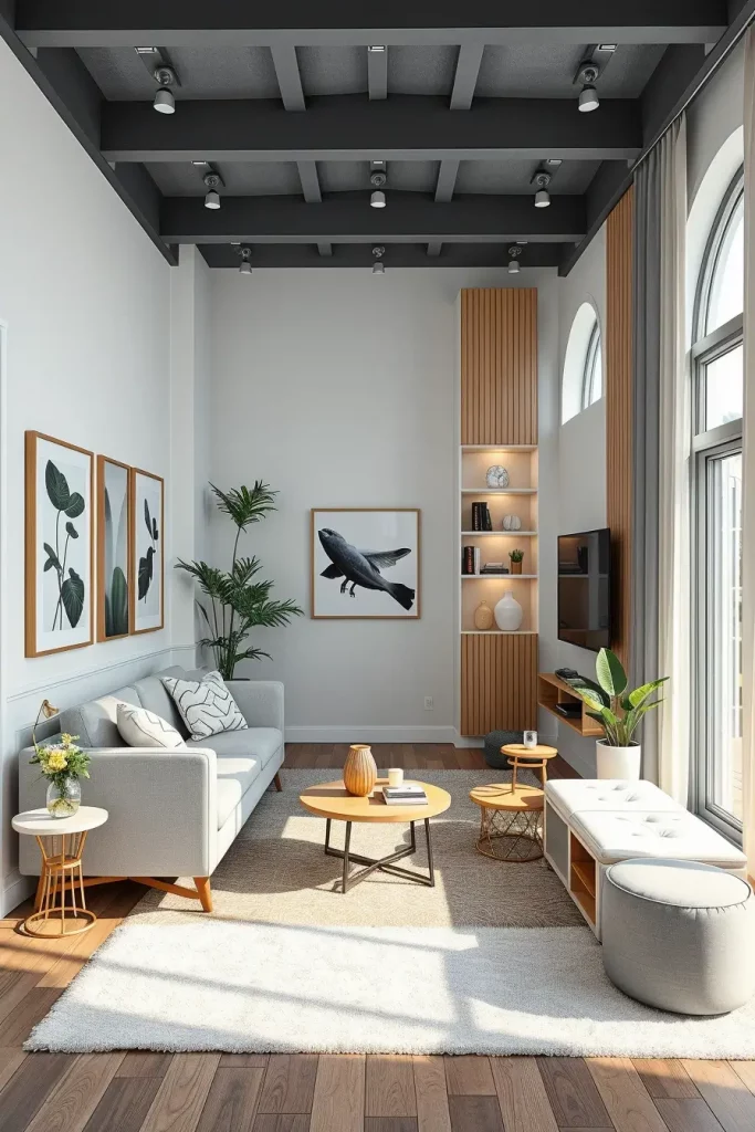 I pay more attention to multifunctional pieces of furniture, i.e., sofas with storage, nestable coffee tables, and desks mounted on walls. Mirrors and reflective surfaces can be used to open up narrow spaces whereas vertical storage will maximize the height.