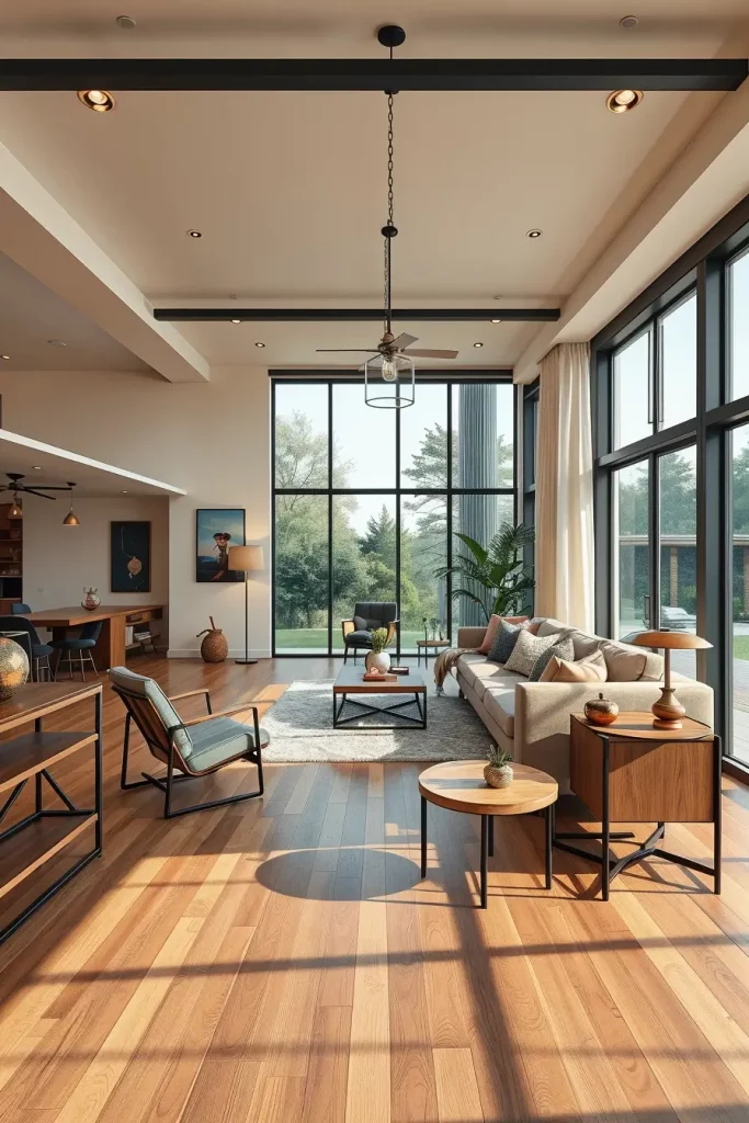 In my design of such an interior, I usually have used reclaimed oak or walnut on the floor and combined it with brushed nickel or matte black furniture frames. The combination is perfect as it unites the natural coziness and smooth organization. This balanced style is complemented by metal coffee tables topped with wooden tops or shelving iron bracketed.