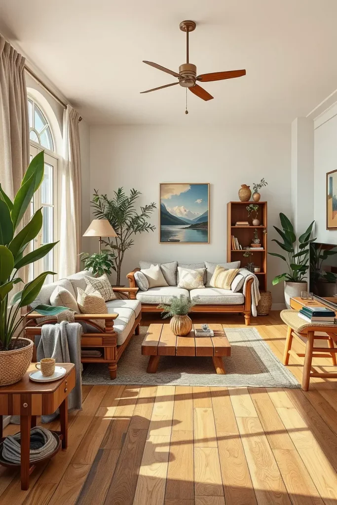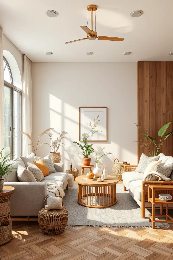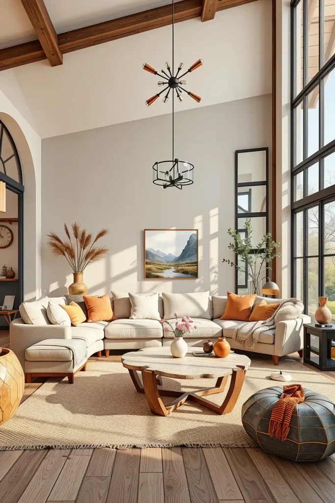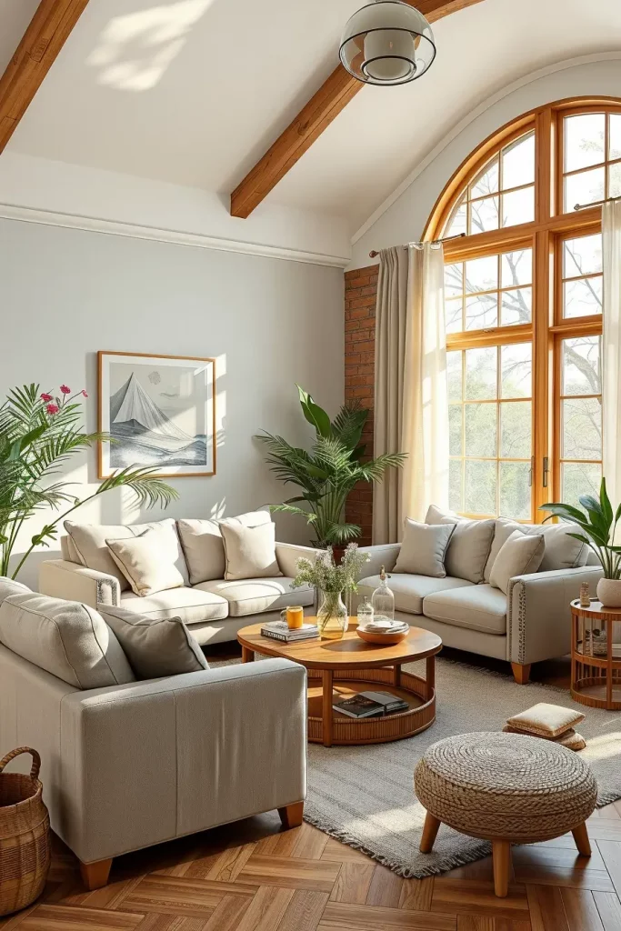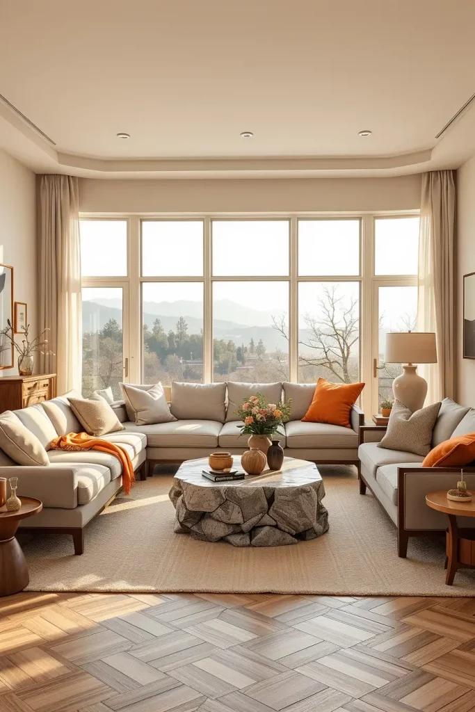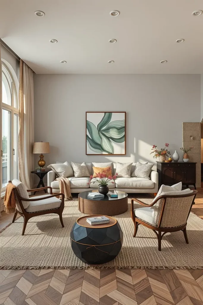 I would prefer beige, textured sofas, stone coffee tables, and off-white curtains which are good filters of light, as part of my favorite features of such spaces. The simplicity of the work is not overwhelmed by adding more layers of accents such as clay vases, woven baskets or terracotta decor.