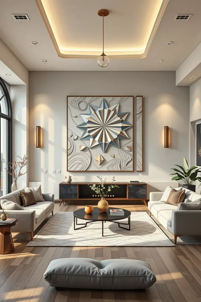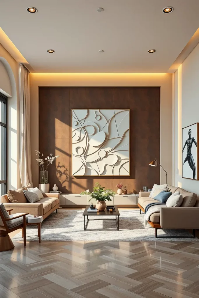 In designing such rooms, I would prefer large artworks or installations consisting of plaster, metal or wood. There is also drama and depth with sculptures on the wall and geometric lighting. The backgrounds are neutral and do not overload these elements.