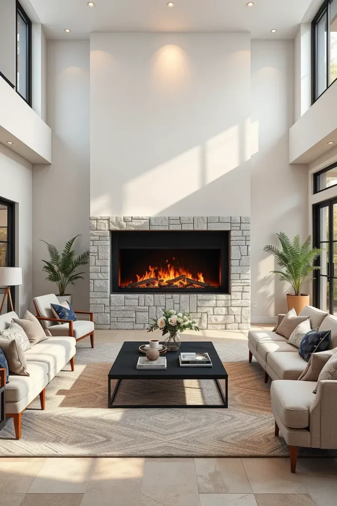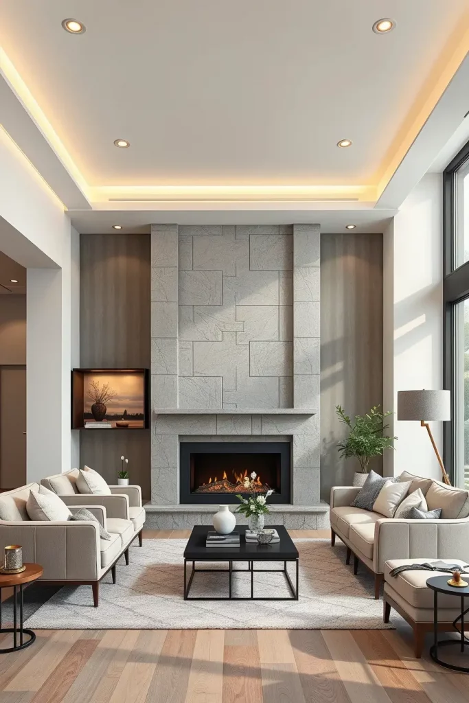 Wall-mounted or linear fireplaces surrounded by stone, concrete, or plaster are also frequently suggested by me. These are contemporary structures that are not only warming but also work as art points. It is better to arrange comfort-furniture in such a way that it will be symmetrical to the fireplace which has been placed to create an effect of balance in the interior.