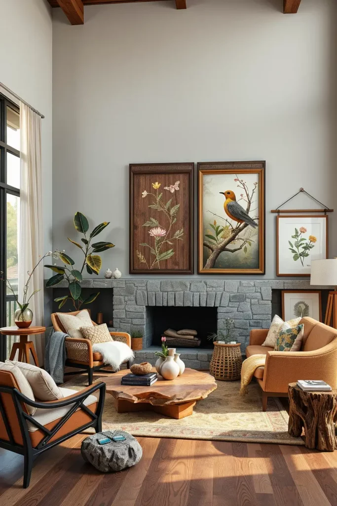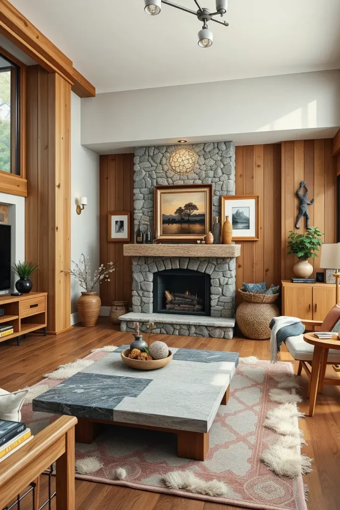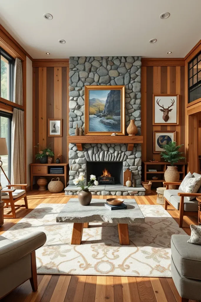 Wood and stone in a living room is a sure way to make it nature-themed and earthy. My favorite contrast would be warm-toned woods such as oak or walnut and cool textured stone such as slate or marble. These materials add reality and a dimension to the space.