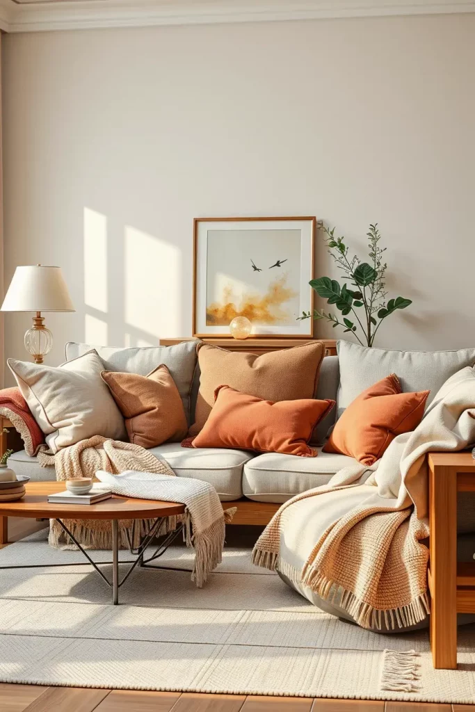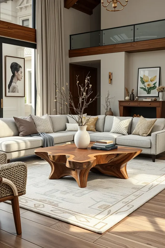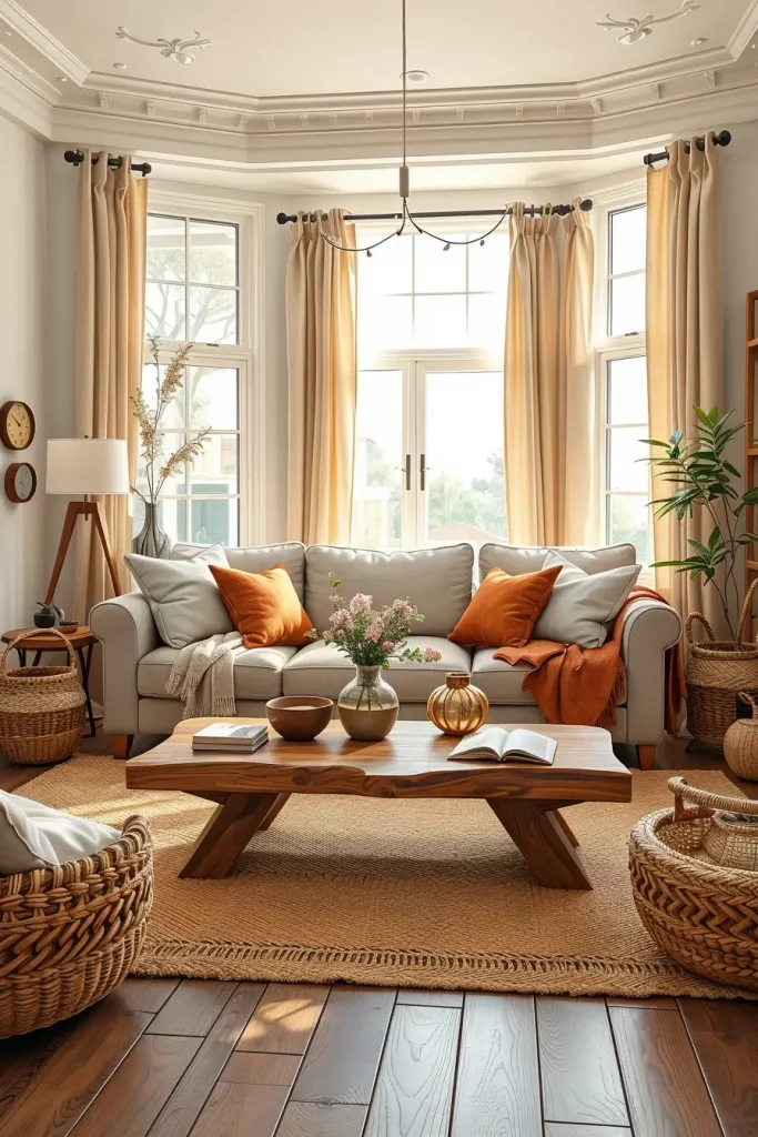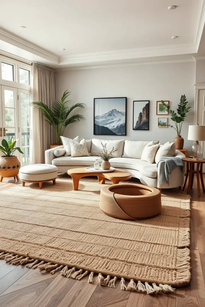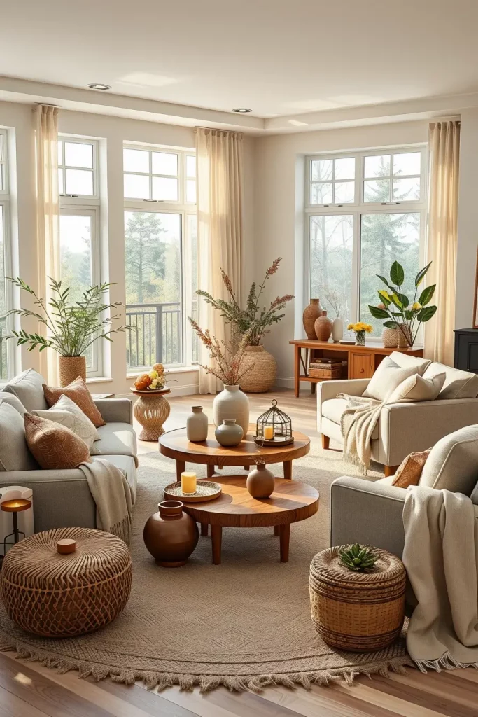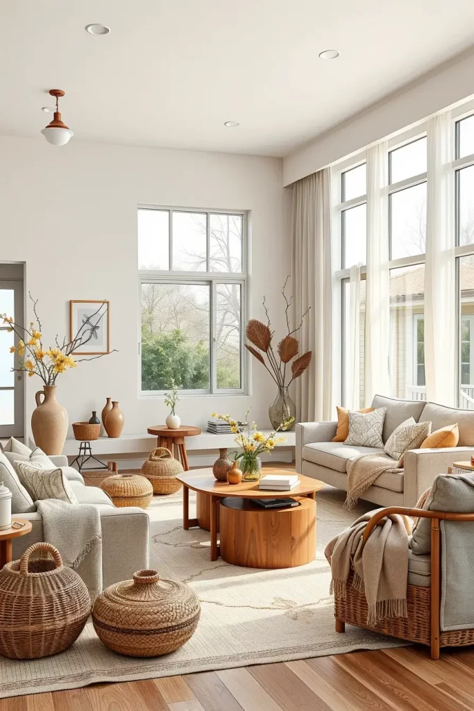 I find that among the easiest things to do to ensure that a living room with organic shapes and natural tones does not get dull is to make slight seasonal adjustments. This does not involve a complete redesign- it only involves a rotation of accent pieces. As an example, in spring I could replace heavier throws with lighter linen ones and add more greenery. I bring in darker cushions and a heavier woven rug in the fall to make the room look and feel warmer.