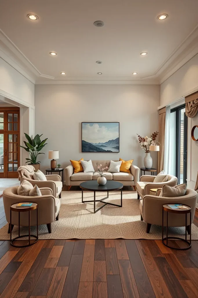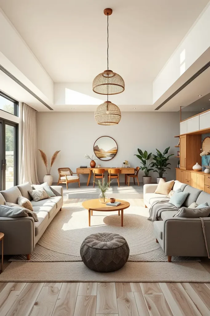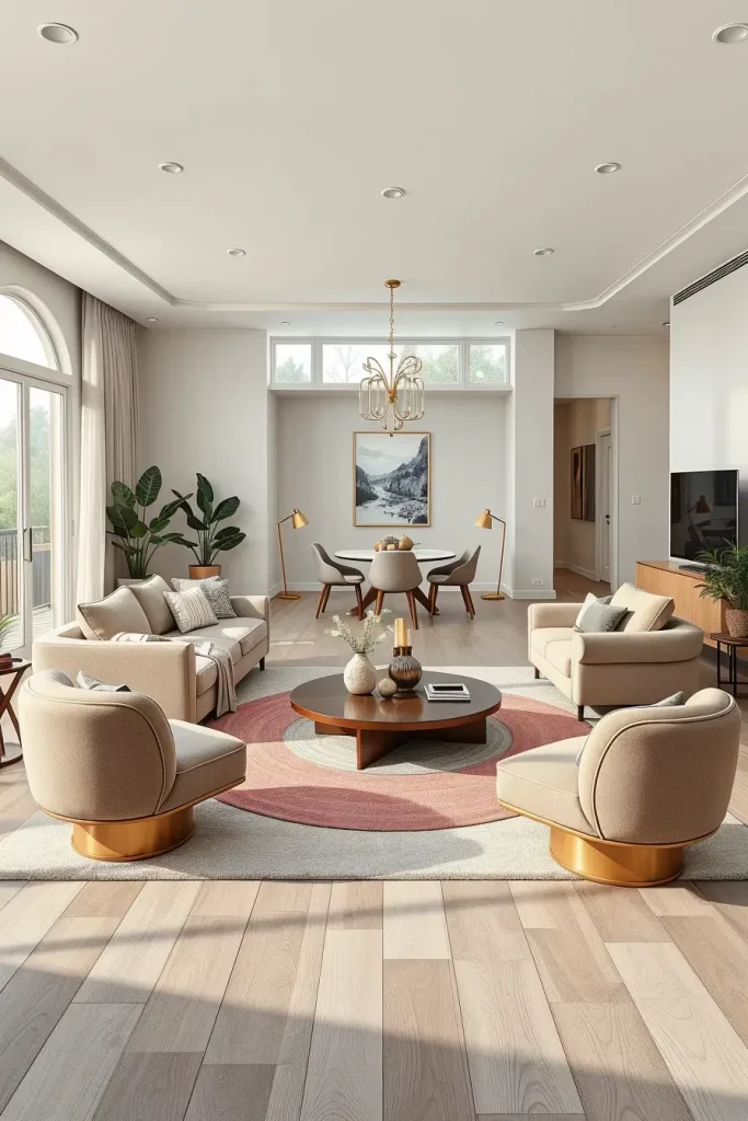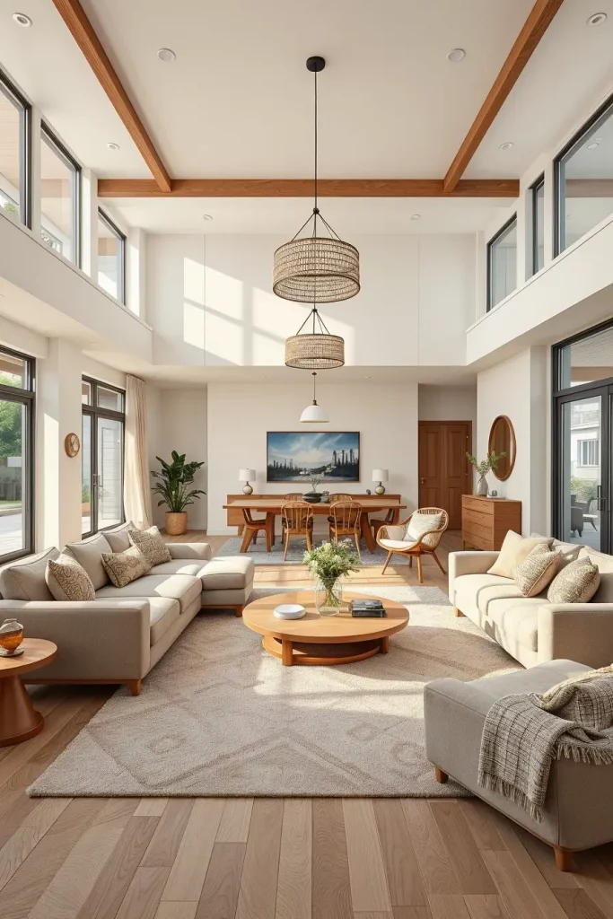 When I am designing an open plan, I select furniture that has soft curves i.e. rounded sofas, coffee tables with soft edges, and rugs with organic shapes as they assist in softening the overall effect. I use natural materials such as oak, linen and jute, which mix well with soft beige, clay and sand colors. Even storage items, like low wooden consoles, are chosen with their simple, non-obtrusive shapes, so that the room does not feel crammed.