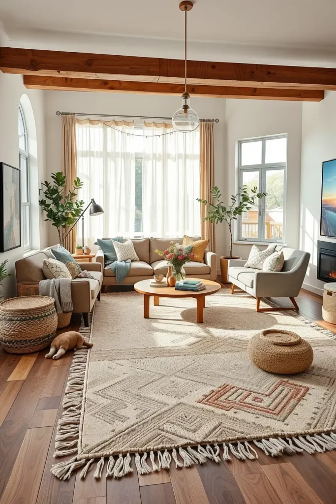 A textured area rug with flowing patterns is one thing I usually incorporate into an open layout, it helps anchor furniture and further emphasize the natural, fluid theme. Adding layers of light, like pendant lights with woven shades and subtle floor lamps, will also add flexibility to the layout without sacrificing the light, open, connected atmosphere.