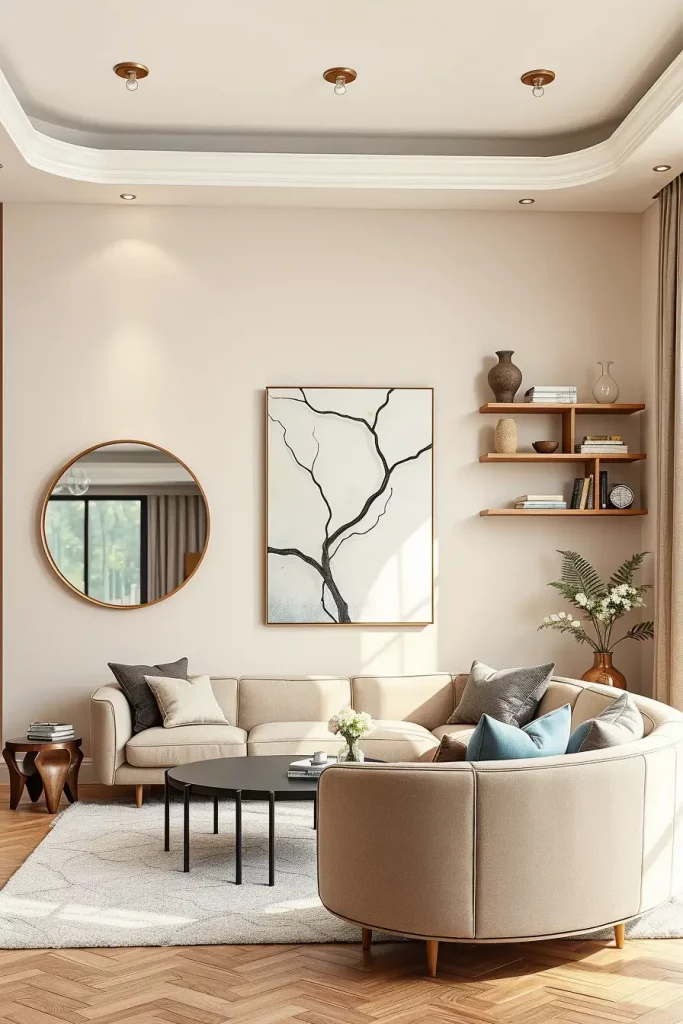 I may use neutral walls and a statement curved mirror, abstract organic wall art, or sculptural shelving in my work. This strategy makes the eye focus on the shapes but not to be distracted by strong colors.