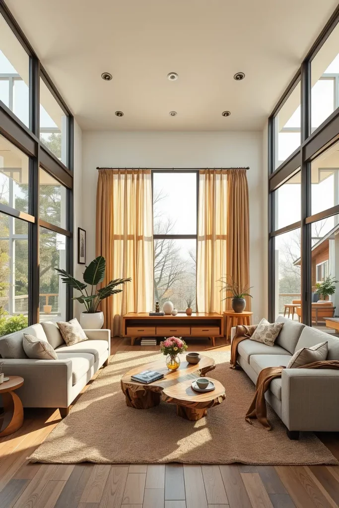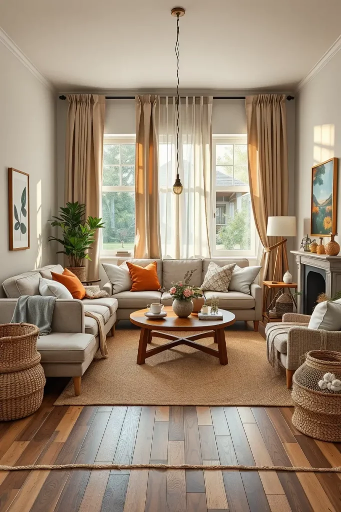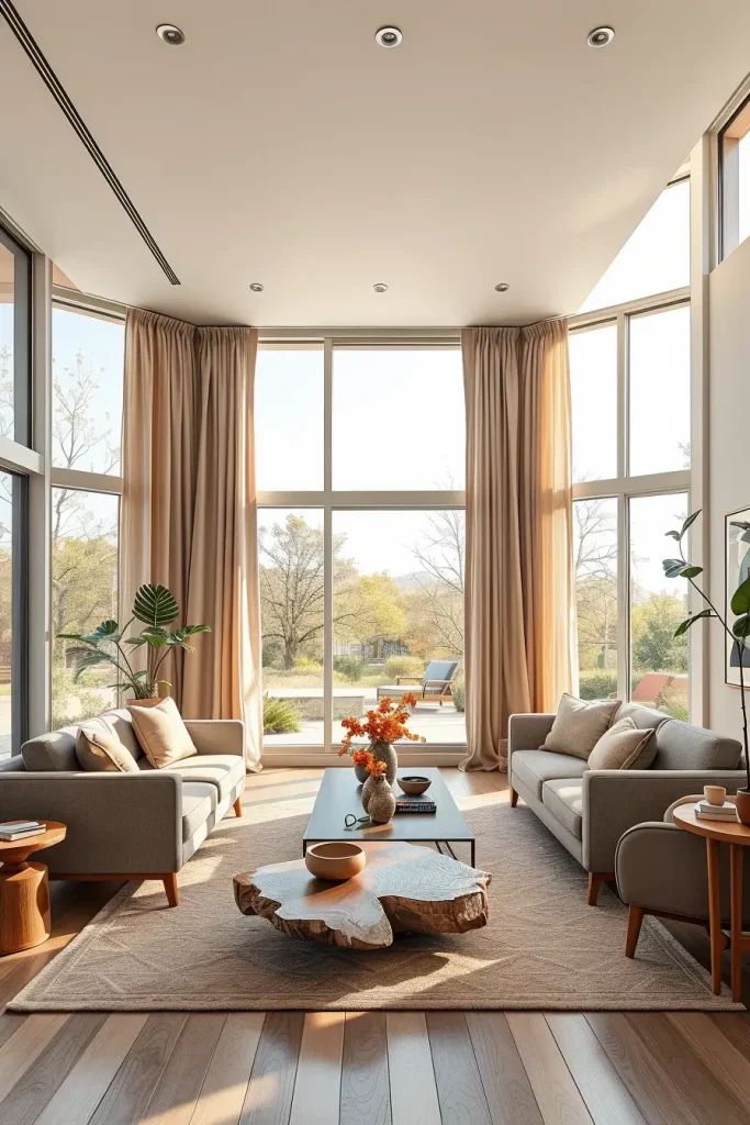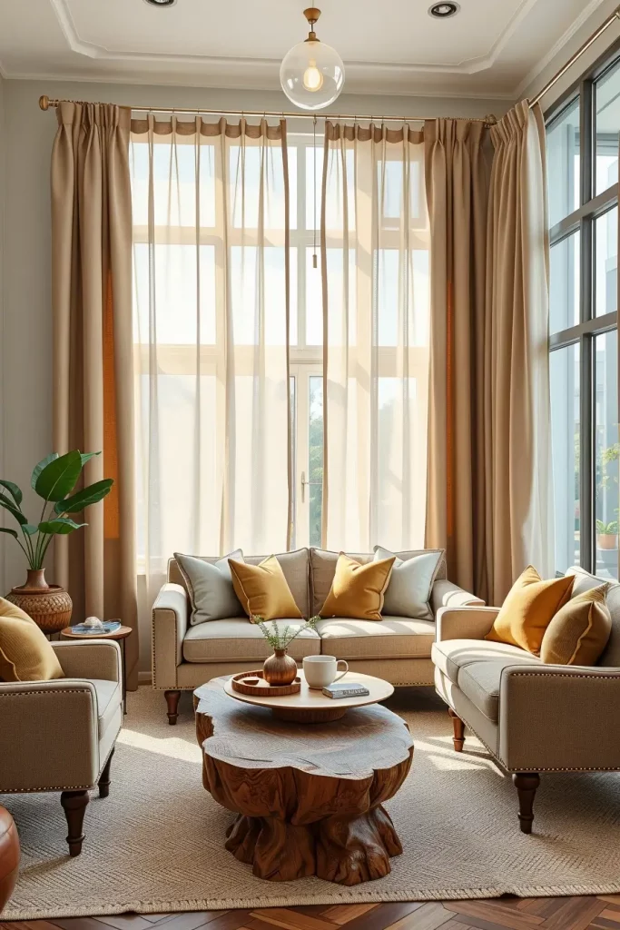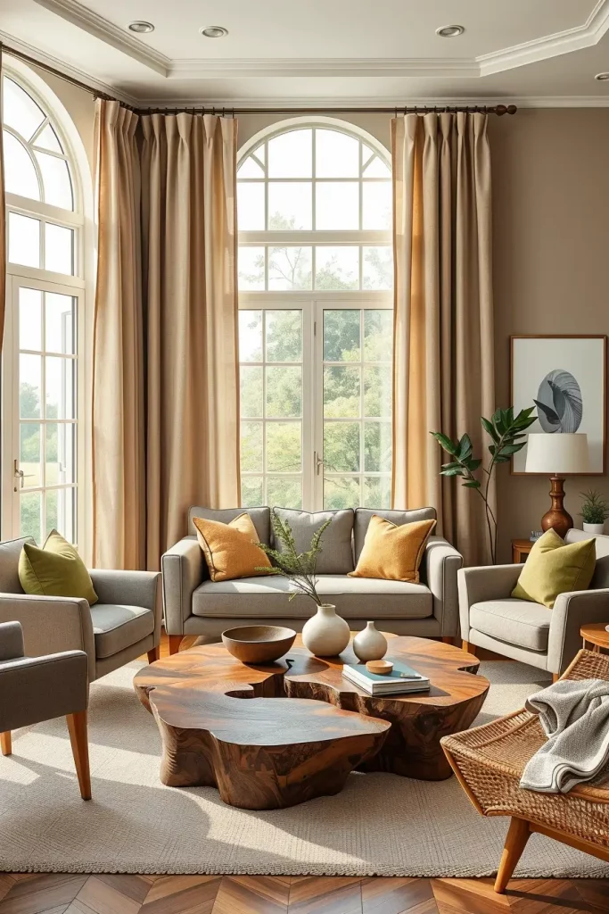 Selecting the appropriate curtains and upholstery in earthy tones would assist in uniting the color scheme of a living room that is centered on organic design. I prefer soft, dull colors such as sand, clay, olive and taupe to achieve a seamless, nature-inspired appearance.