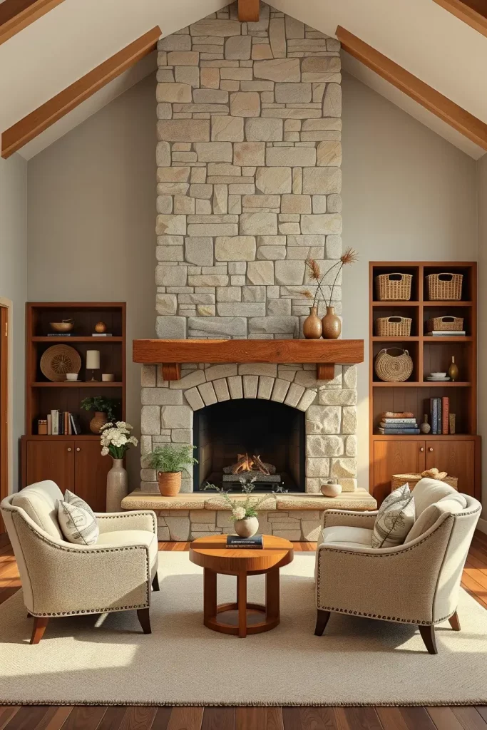 I would also recommend having built-in shelves or niches on either side of the fireplace to display handcrafted decor or woven baskets, as well, to enhance the organic atmosphere.