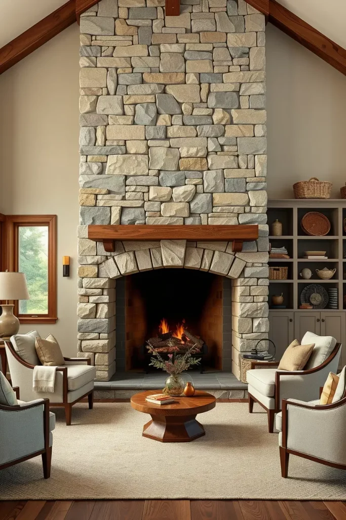 I frequently use such materials as limestone, slate, or river rock as the fireplace facade which has its distinctive colors and patterns. Simple wooden mantel and seating area surround it, so that the stone is the star. Two soft armchairs facing the fire place assist in forming a cozy socializing area.