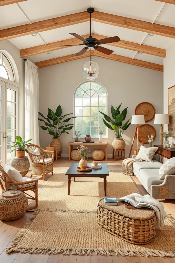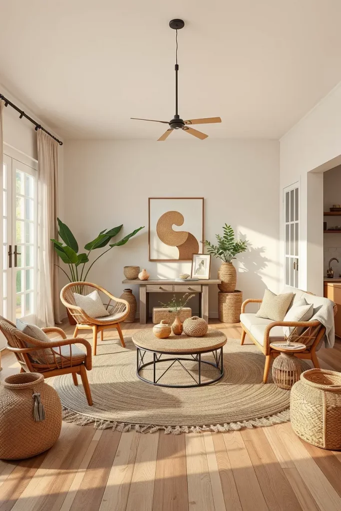 Woven cane back chairs, wicker coffee tables or jute area rugs will work perfectly with this style. Even storage baskets made of woven material can be used as decorations when placed strategically around sitting places or shelves.