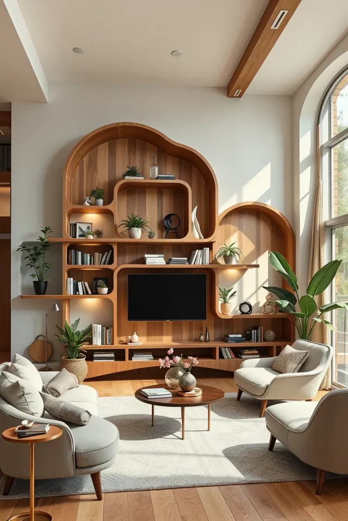 A bespoke wall unit with softly curving shelves can be used to store books, plants, and ornamental items as well as a sculptural piece. Selecting a wood finish in natural colors will make it blend well with the rest of the palette of the room.