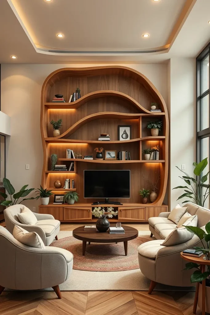 I like to use fluid shelving designs in living rooms where organic shapes are the center of attraction. These shelves are curvy, asymmetrical, and have flowing edges unlike the standard boxy units that have no motion.