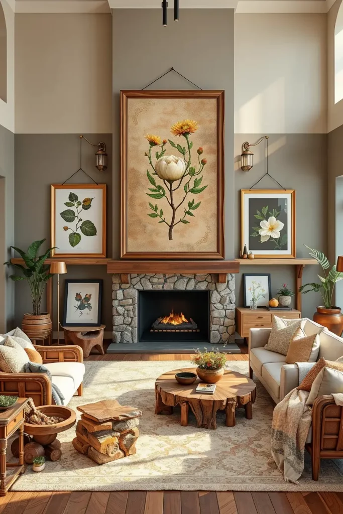 Nature-inspired art is a combination of the idea of natural forms and natural colors in a living room. These works ground the design whether they are large canvases with a forest scene, abstract paintings in earthy tones, or framed botanical prints.